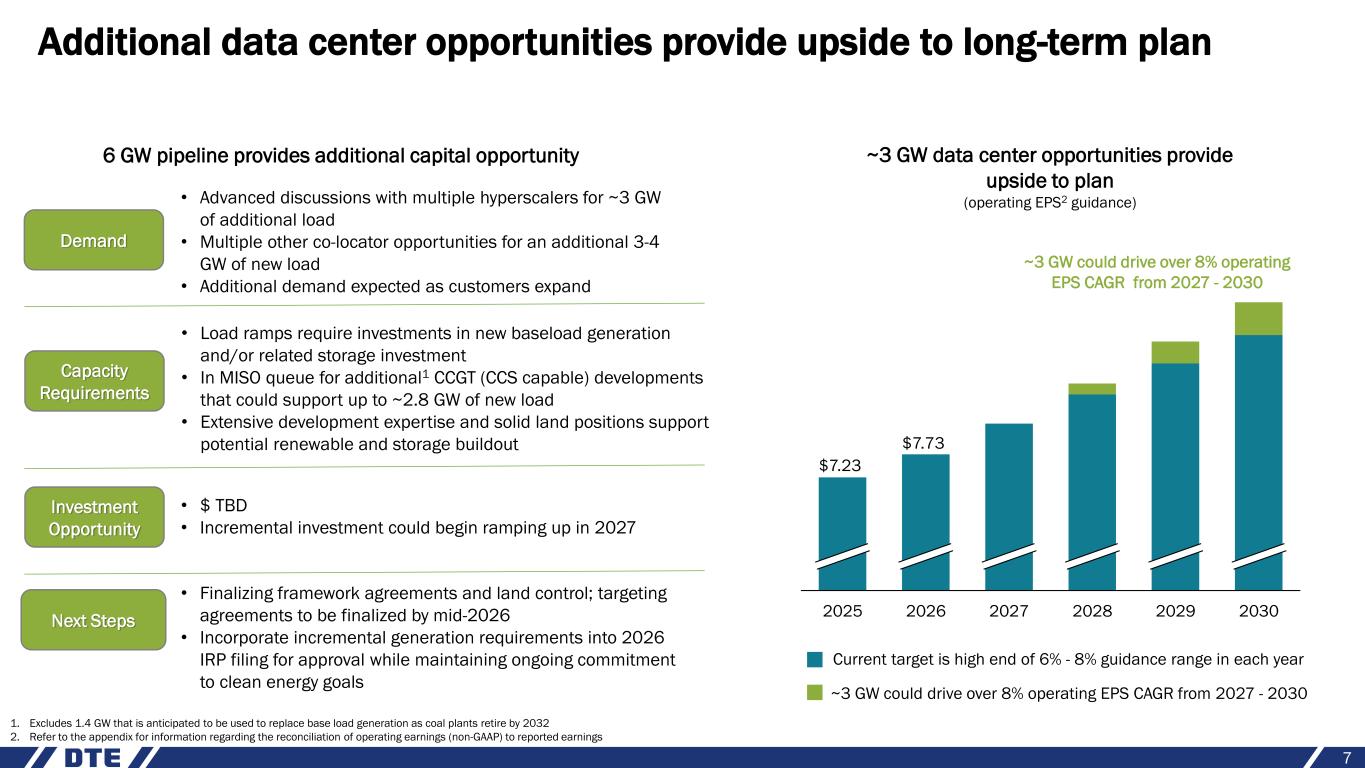 Recently executed agreement for ~1.4 GW of new data center load drives growth and customer affordability benefits Overview Capacity Requirements Investment Next Steps • Executed agreement with a subsidiary of Oracle • ~1.4 GW of demand ramping up over next 2 to 3 years • 19-year power supply agreement with minimum monthly charges • 15-year energy storage contract covers incremental investment • Load ramp supported by existing capacity and new energy storage investments • Nearly $2 billion energy storage investment included in current 5-year plan to support this new load • Submitted regulatory filing on October 31 requesting approval of data center contract • Energy storage investments ramp up beginning in 2026 6 Data center drives ~$300 million of annual affordability benefits for existing customers once fully ramped Estimated cost of service by class 31% 26% 26% 21% 43% 35% 18% Current Future (with data center customer) Data center customer Residential Commercial Industrial
