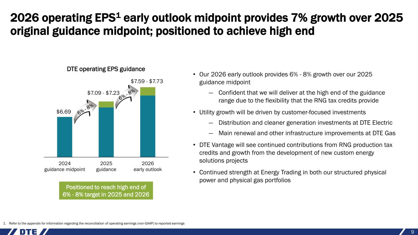 Economic development opportunities combined with our continuous improvement culture will sustain our track record of managing customer affordability 3.0% 15.8% 21.3% DTE Electric Great Lakes average National average Top tier affordability Total electric residential bill change % from 2021 to 20251 ✓ Data center load growth helps drive affordability headroom for existing customers as excess capacity is sold ✓ Our distinctive continuous improvement culture will continue to drive cost management ✓ Shift from coal to renewables and natural gas drives fuel and O&M cost reductions ✓ Diversified energy mix maintains flexibility to adapt to future technology advancements ✓ IRA supports transition to cleaner energy while supporting customer affordability goals 8 Electric and Gas utility expenditure as a percent of Michigan disposable income2 1.7 0.0 1.6 1.8 2.0 2.2 2.3 2.1 1.9 2 0 1 8 2 0 1 9 2 0 2 0 2 0 2 1 2 0 2 2 1.6% 2 0 2 3 2 0 1 4 2 0 1 3 2 0 1 2 2 0 1 1 2 0 1 0 % 2 0 1 6 2 0 1 7 2 0 1 5 1. Source: Energy Information Administration (EIA). Ending point is the average 12-month rolling residential bill from April 2024 to March 2025 2. Source: EIA, BEA SAINC1 Personal Income Summary: Personal Income, Population, Per Capita Personal Income We continue to prioritize affordability
