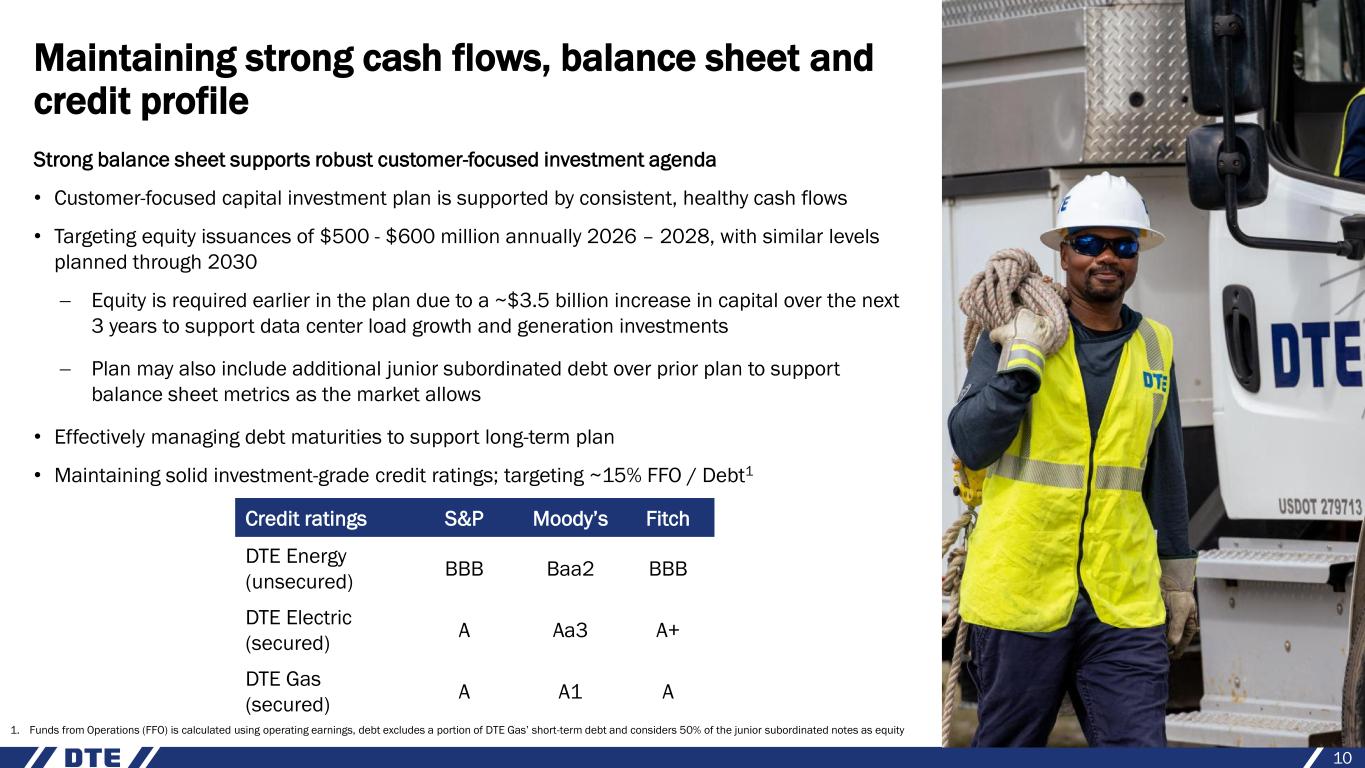 2026 operating EPS1 early outlook midpoint provides 7% growth over 2025 original guidance midpoint; positioned to achieve high end 9 1. Refer to the appendix for information regarding the reconciliation of operating earnings (non-GAAP) to reported earnings 2024 guidance midpoint 2025 guidance 2026 early outlook $7.59 - $7.73 $7.09 - $7.23 DTE operating EPS guidance Positioned to reach high end of 6% - 8% target in 2025 and 2026 $6.69 • Our 2026 early outlook provides 6% - 8% growth over our 2025 guidance midpoint — Confident that we will deliver at the high end of the guidance range due to the flexibility that the RNG tax credits provide • Utility growth will be driven by customer-focused investments — Distribution and cleaner generation investments at DTE Electric — Main renewal and other infrastructure improvements at DTE Gas • DTE Vantage will see continued contributions from RNG production tax credits and growth from the development of new custom energy solutions projects • Continued strength at Energy Trading in both our structured physical power and physical gas portfolios