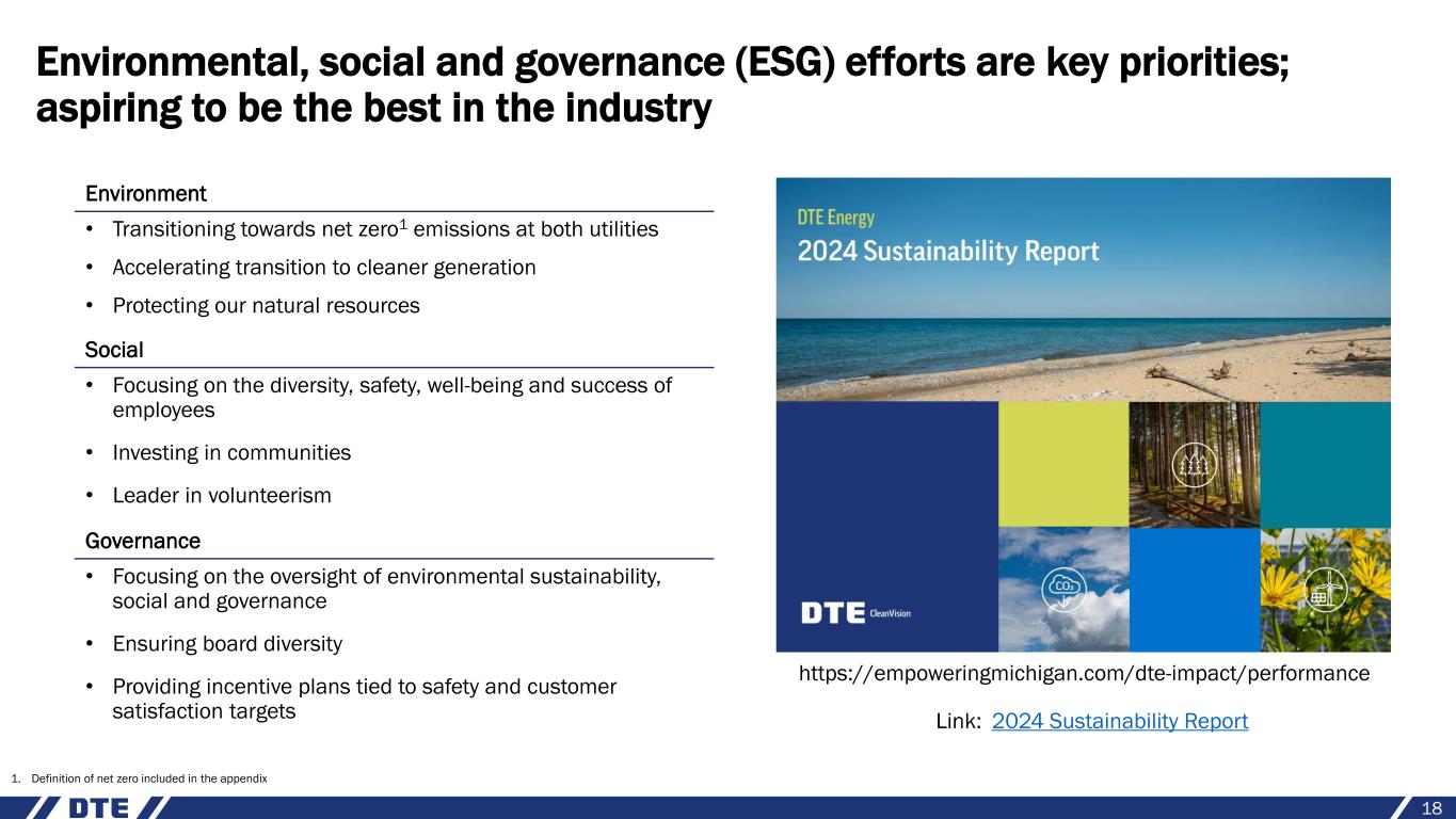 Environmental, social and governance (ESG) efforts are key priorities; aspiring to be the best in the industry Environment • Transitioning towards net zero1 emissions at both utilities • Accelerating transition to cleaner generation • Protecting our natural resources Social • Focusing on the diversity, safety, well-being and success of employees • Investing in communities • Leader in volunteerism Governance • Focusing on the oversight of environmental sustainability, social and governance • Ensuring board diversity • Providing incentive plans tied to safety and customer satisfaction targets 18 1. Definition of net zero included in the appendix 2024 Sustainability Report https://empoweringmichigan.com/dte-impact/performance Link: