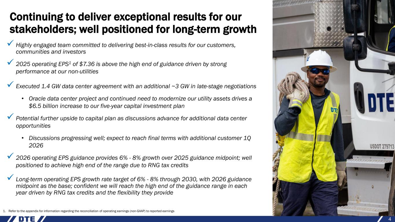 Continuing to deliver exceptional results for our stakeholders; well positioned for long-term growth 4 1. Refer to the appendix for information regarding the reconciliation of operating earnings (non-GAAP) to reported earnings ✓ Highly engaged team committed to delivering best-in-class results for our customers, communities and investors ✓ 2025 operating EPS1 of $7.36 is above the high end of guidance driven by strong performance at our non-utilities ✓ Executed 1.4 GW data center agreement with an additional ~3 GW in late-stage negotiations • Oracle data center project and continued need to modernize our utility assets drives a $6.5 billion increase to our five-year capital investment plan ✓ Potential further upside to capital plan as discussions advance for additional data center opportunities • Discussions progressing well; expect to reach final terms with additional customer 1Q 2026 ✓ 2026 operating EPS guidance provides 6% - 8% growth over 2025 guidance midpoint; well positioned to achieve high end of the range due to RNG tax credits ✓ Long-term operating EPS growth rate target of 6% - 8% through 2030, with 2026 guidance midpoint as the base; confident we will reach the high end of the guidance range in each year driven by RNG tax credits and the flexibility they provide
