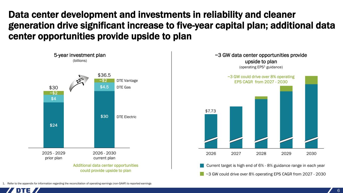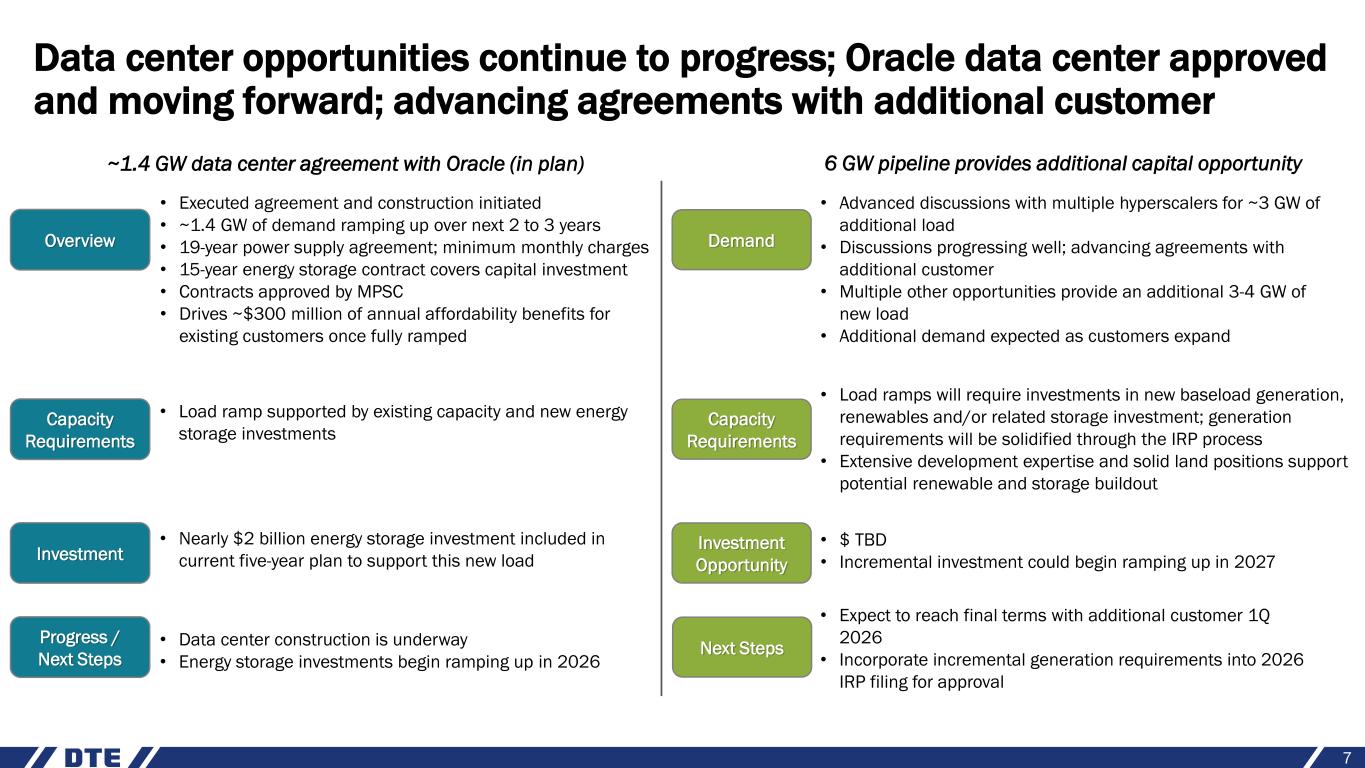 Data center development and investments in reliability and cleaner generation drive significant increase to five-year capital plan; additional data center opportunities provide upside to plan 6 1. Refer to the appendix for information regarding the reconciliation of operating earnings (non-GAAP) to reported earnings 2026 2027 2028 2029 2030 $7.73 ~3 GW data center opportunities provide upside to plan (operating EPS1 guidance) ~3 GW could drive over 8% operating EPS CAGR from 2027 - 2030 ~3 GW could drive over 8% operating EPS CAGR from 2027 - 2030 Current target is high end of 6% - 8% guidance range in each year $24 $4 ~$2 2025 - 2029 prior plan 2026 - 2030 current plan $30 $36.5 DTE Electric DTE Gas DTE Vantage22 % 5-year investment plan (billions) ~$2 $4.5 $30 Additional data center opportunities could provide upside to plan