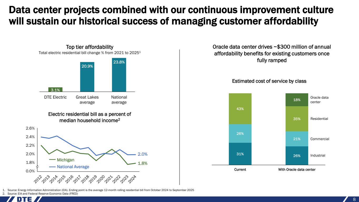 Data center opportunities continue to progress; Oracle data center approved and moving forward; advancing agreements with additional customer ~1.4 GW data center agreement with Oracle (in plan) Demand Capacity Requirements Investment Opportunity Next Steps • $ TBD • Incremental investment could begin ramping up in 2027 • Expect to reach final terms with additional customer 1Q 2026 • Incorporate incremental generation requirements into 2026 IRP filing for approval 7 Overview Capacity Requirements Investment Progress / Next Steps • Executed agreement and construction initiated • ~1.4 GW of demand ramping up over next 2 to 3 years • 19-year power supply agreement; minimum monthly charges • 15-year energy storage contract covers capital investment • Contracts approved by MPSC • Drives ~$300 million of annual affordability benefits for existing customers once fully ramped • Load ramp supported by existing capacity and new energy storage investments • Nearly $2 billion energy storage investment included in current five-year plan to support this new load • Data center construction is underway • Energy storage investments begin ramping up in 2026 6 GW pipeline provides additional capital opportunity • Advanced discussions with multiple hyperscalers for ~3 GW of additional load • Discussions progressing well; advancing agreements with additional customer • Multiple other opportunities provide an additional 3-4 GW of new load • Additional demand expected as customers expand • Load ramps will require investments in new baseload generation, renewables and/or related storage investment; generation requirements will be solidified through the IRP process • Extensive development expertise and solid land positions support potential renewable and storage buildout