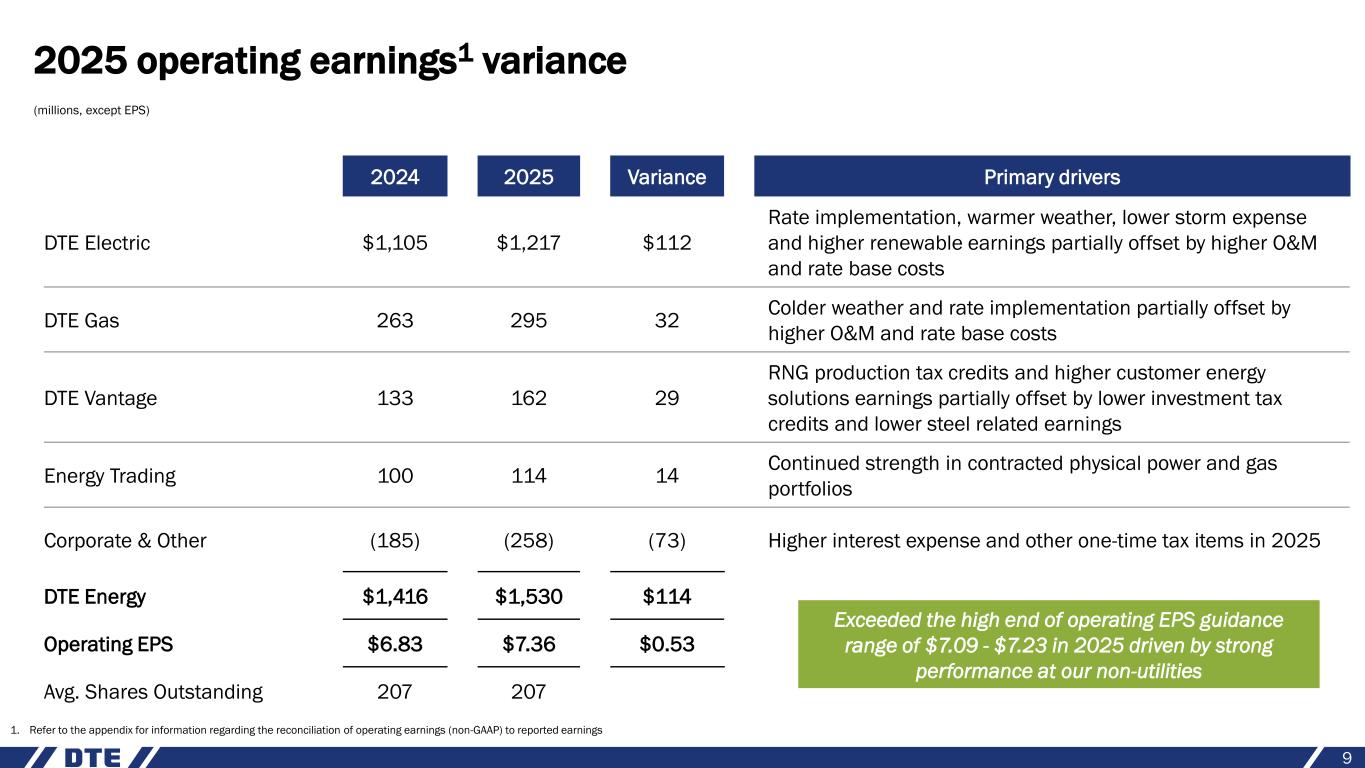 2025 operating earnings1 variance 9 1. Refer to the appendix for information regarding the reconciliation of operating earnings (non-GAAP) to reported earnings 2024 2025 Variance Primary drivers DTE Electric $1,105 $1,217 $112 Rate implementation, warmer weather, lower storm expense and higher renewable earnings partially offset by higher O&M and rate base costs DTE Gas 263 295 32 Colder weather and rate implementation partially offset by higher O&M and rate base costs DTE Vantage 133 162 29 RNG production tax credits and higher customer energy solutions earnings partially offset by lower investment tax credits and lower steel related earnings Energy Trading 100 114 14 Continued strength in contracted physical power and gas portfolios Corporate & Other (185) (258) (73) Higher interest expense and other one-time tax items in 2025 DTE Energy $1,416 $1,530 $114 Operating EPS $6.83 $7.36 $0.53 Avg. Shares Outstanding 207 207 (millions, except EPS) Exceeded the high end of operating EPS guidance range of $7.09 - $7.23 in 2025 driven by strong performance at our non-utilities