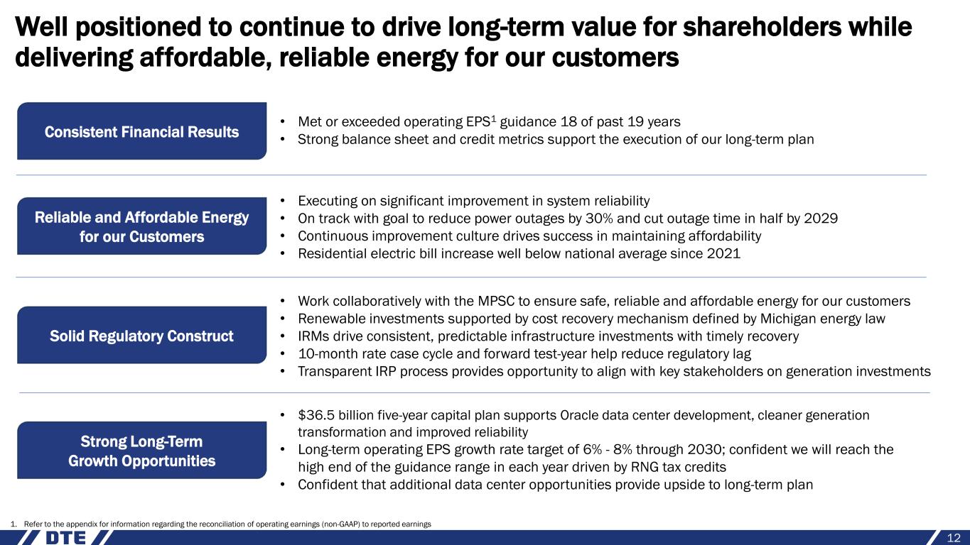 Maintaining strong cash flows, balance sheet and credit profile 11 Credit ratings S&P Moody’s Fitch DTE Energy (unsecured) BBB Baa2 BBB DTE Electric (secured) A Aa3 A+ DTE Gas (secured) A A1 A Strong balance sheet supports robust customer-focused investment agenda • Customer-focused capital investment plan is supported by consistent, healthy cash flows • Targeting equity issuances of $500 - $600 million annually 2026 – 2028, with similar levels planned through 2030 − The equity need is due to a ~$3.5 billion increase in capital over the next 3 years to support data center load growth and generation investments − Plan may also include additional junior subordinated debt to support balance sheet metrics • Effectively managing debt maturities to support long-term plan • Maintaining solid investment-grade credit ratings; targeting ~15% FFO / Debt1 1. Funds from Operations (FFO) is calculated using operating earnings, debt excludes a portion of DTE Gas’ short-term debt and considers 50% of the junior subordinated notes as equity