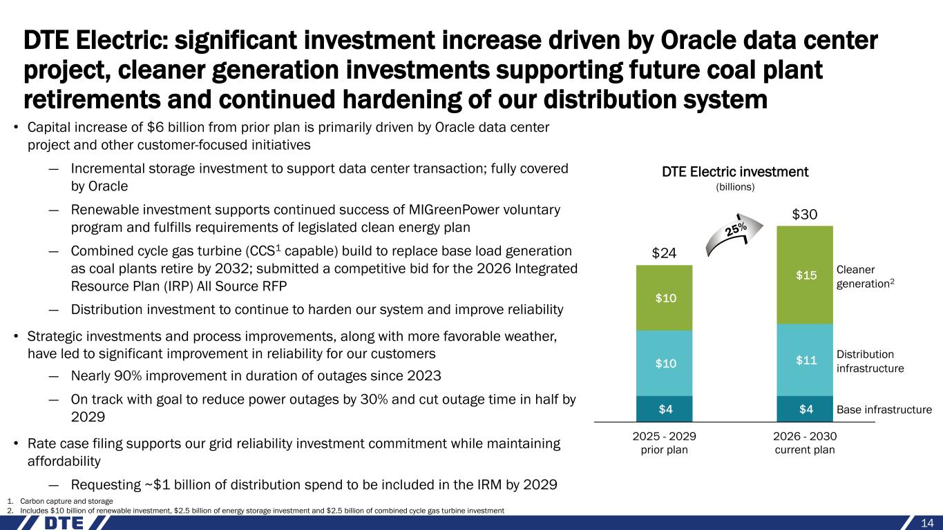 12 Well positioned to continue to drive long-term value for shareholders while delivering affordable, reliable energy for our customers Strong Long-Term Growth Opportunities Solid Regulatory Construct Reliable and Affordable Energy for our Customers Consistent Financial Results • Met or exceeded operating EPS1 guidance 18 of past 19 years • Strong balance sheet and credit metrics support the execution of our long-term plan • Executing on significant improvement in system reliability • On track with goal to reduce power outages by 30% and cut outage time in half by 2029 • Continuous improvement culture drives success in maintaining affordability • Residential electric bill increase well below national average since 2021 • Work collaboratively with the MPSC to ensure safe, reliable and affordable energy for our customers • Renewable investments supported by cost recovery mechanism defined by Michigan energy law • IRMs drive consistent, predictable infrastructure investments with timely recovery • 10-month rate case cycle and forward test-year help reduce regulatory lag • Transparent IRP process provides opportunity to align with key stakeholders on generation investments • $36.5 billion five-year capital plan supports Oracle data center development, cleaner generation transformation and improved reliability • Long-term operating EPS growth rate target of 6% - 8% through 2030; confident we will reach the high end of the guidance range in each year driven by RNG tax credits • Confident that additional data center opportunities provide upside to long-term plan 1. Refer to the appendix for information regarding the reconciliation of operating earnings (non-GAAP) to reported earnings