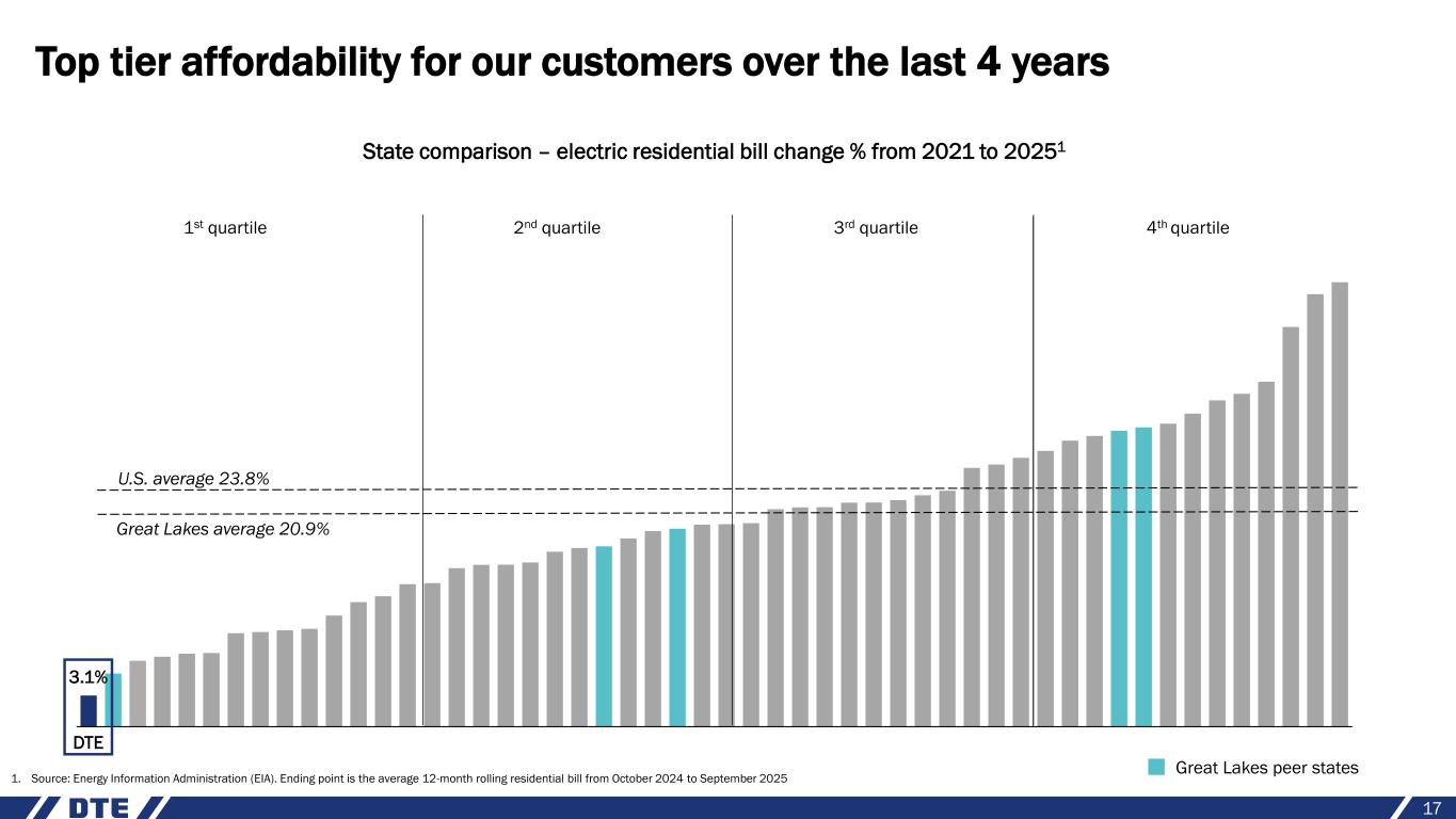 DTE Vantage: strategic focus on custom energy solutions projects 16 JN • Progressing on project development − Continuing construction on the long-term, fixed-fee custom energy solutions project with Ford Motor Company; expecting commercial operation in 2026 − Began construction on project to design, build, own, operate and maintain a 42 MW combined heat and power project serving a large industrial customer; expecting commercial operation in early 2027 − ~$2 billion five-year capital investment plan supports continued execution of utility- like, long-term, fixed-fee contracted projects and decarbonization growth opportunities • New projects coming on-line in 2026 and 2027, combined with a solid long-term development pipeline, provide confidence we can achieve our DTE 6% - 8% operating EPS1 growth through 2030 − 2030 operating earnings projection of $150 - $160 million following the expiration of RNG tax credits in 2029 1. Refer to the appendix for information regarding the reconciliation of operating earnings (non-GAAP) to reported earnings