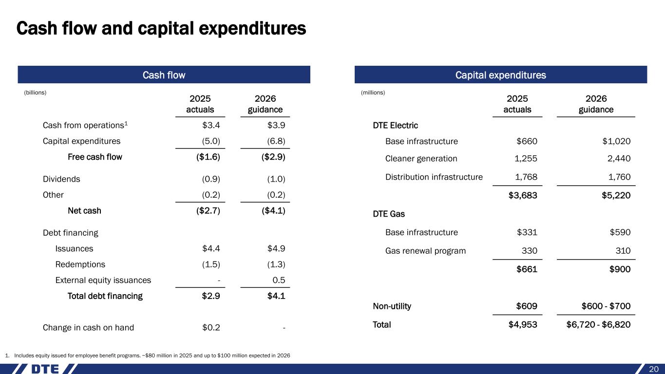 Weather impact on sales 19 Cooling degree days1 Operating earnings2 impact of weather Weather normal sales1 DTE Electric Heating degree days3 Operating earnings2 impact of weather DTE Gas (millions) (per share) 4Q YTD 4Q YTD 2024 ($10) ($31) ($0.05) ($0.15) 2025 $12 $7 $0.06 $0.04 (millions) (per share) 4Q YTD 4Q YTD 2024 ($12) ($61) ($0.06) ($0.30) 2025 $18 $26 $0.09 $0.12 2024 2025 % Change Actuals 926 898 (3%) Normal 915 913 0% Deviation from normal 1% (2%) 4Q 2024 4Q 2025 % Change 2024 2025 % Change Actuals 1,948 2,332 20% 5,306 6,482 22% Normal 2,140 2,118 (1%) 6,288 6,162 (2%) Deviation from normal (9%) 10% (16%) 5% (GWh) 2024 2025 % Change Residential 15,369 15,475 0.7% Commercial 19,039 18,871 (0.9%) Industrial 10,125 9.953 (1.7%) Other 199 192 (3.5%) 44,732 44.491 (0.5%) 2025 sales up 1.8% after adjusting for Leap Year (0.3%) and Energy Optimization (2%) 1. DTE Electric 2024 weather normalized data based on 2008 – 2022 weather and 2025 weather normalized data based on 2009 – 2023 weather 2. Refer to the appendix for information regarding the reconciliation of operating earnings (non-GAAP) to reported earnings 3. DTE Gas 2024 weather normalized data based on 2009 – 2023 weather and 2025 weather normalized data based on 2010 – 2024 weather