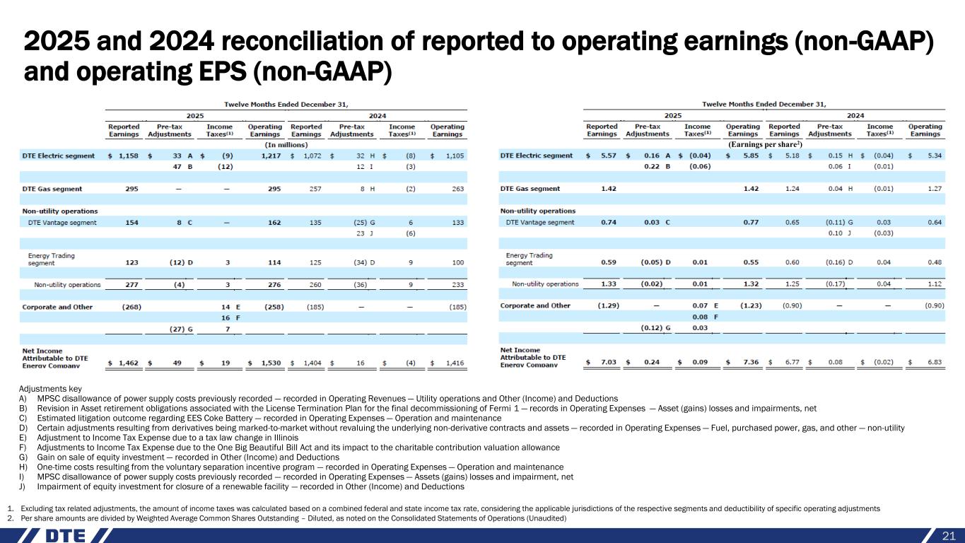2025 and 2024 reconciliation of reported to operating earnings (non-GAAP) and operating EPS (non-GAAP) 21 Adjustments key A) MPSC disallowance of power supply costs previously recorded — recorded in Operating Revenues — Utility operations and Other (Income) and Deductions B) Revision in Asset retirement obligations associated with the License Termination Plan for the final decommissioning of Fermi 1 — records in Operating Expenses — Asset (gains) losses and impairments, net C) Estimated litigation outcome regarding EES Coke Battery — recorded in Operating Expenses — Operation and maintenance D) Certain adjustments resulting from derivatives being marked-to-market without revaluing the underlying non-derivative contracts and assets — recorded in Operating Expenses — Fuel, purchased power, gas, and other — non-utility E) Adjustment to Income Tax Expense due to a tax law change in Illinois F) Adjustments to Income Tax Expense due to the One Big Beautiful Bill Act and its impact to the charitable contribution valuation allowance G) Gain on sale of equity investment — recorded in Other (Income) and Deductions H) One-time costs resulting from the voluntary separation incentive program — recorded in Operating Expenses — Operation and maintenance I) MPSC disallowance of power supply costs previously recorded — recorded in Operating Expenses — Assets (gains) losses and impairment, net J) Impairment of equity investment for closure of a renewable facility — recorded in Other (Income) and Deductions 1. Excluding tax related adjustments, the amount of income taxes was calculated based on a combined federal and state income tax rate, considering the applicable jurisdictions of the respective segments and deductibility of specific operating adjustments 2. Per share amounts are divided by Weighted Average Common Shares Outstanding – Diluted, as noted on the Consolidated Statements of Operations (Unaudited) (Earnings per share2)