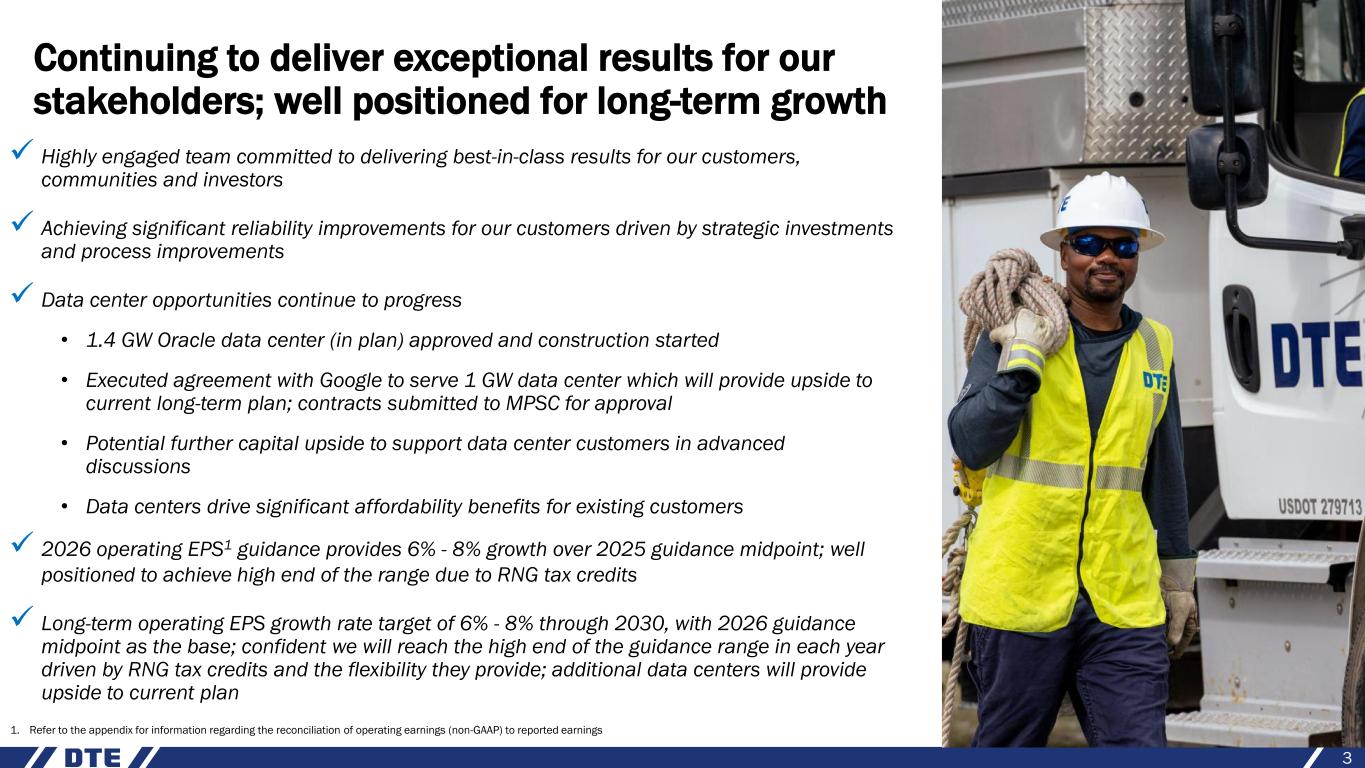 Safe harbor statement 2 The information contained herein is as of the date of this document. DTE Energy expressly disclaims any current intention to update any forward-looking statements contained in this document as a result of new information or future events or developments. Words such as “anticipate,” “believe,” “expect,” “may,” “could,” “projected,” “aspiration,” “plans” and “goals” signify forward-looking statements. Forward-looking statements are not guarantees of future results and conditions but rather are subject to various assumptions, risks and uncertainties that may cause actual future results to be materially different from those contemplated, projected, estimated or budgeted. Many factors may impact forward-looking statements including, but not limited to, the following: the impact of regulation by the EPA, EGLE, the FERC, the MPSC, the NRC, and for DTE Energy, the CFTC and CARB, as well as other applicable governmental proceedings and regulations, including any associated impact on rate structures; the amount and timing of cost recovery allowed as a result of regulatory proceedings, related appeals, or new legislation, including legislative amendments and retail access programs; economic conditions and population changes in our geographic area resulting in changes in demand, customer conservation, and thefts of electricity and, for DTE Energy, natural gas; the operational failure of electric or gas distribution systems or infrastructure; impact of volatility in prices in international steel markets and in prices of environmental attributes generated from renewable natural gas investments on the operations of DTE Vantage; the risk of a major safety incident; environmental issues, laws, regulations, and the increasing costs of remediation and compliance, including actual and potential new federal and state requirements; the cost of protecting assets and customer data against, or damage due to, cyber incidents and terrorism; health, safety, financial, environmental, and regulatory risks associated with ownership and operation of nuclear facilities; volatility in commodity markets, deviations in weather and related risks impacting the results of DTE Energy’s energy trading operations; changes in the cost and availability of coal and other raw materials, purchased power, and natural gas; advances in technology that produce power, store power or reduce or increase power consumption; changes in the financial condition of significant customers and strategic partners; the potential for losses on investments, including nuclear decommissioning trust and benefit plan assets and the related increases in future expense and contributions; access to capital markets and the results of other financing efforts which can be affected by credit agency ratings; instability in capital markets which could impact availability of short and long-term financing; impacts of inflation, tariffs, and the timing and extent of changes in interest rates; the level of borrowings; the potential for increased costs or delays in completion of significant capital projects; changes in, and application of, federal, state, and local tax laws and their interpretations, including the Internal Revenue Code, regulations, rulings, court proceedings, and audits; the effects of weather and other natural phenomena, including climate change, on operations and sales to customers, and purchases from suppliers; unplanned outages at our generation plants; employee relations and the impact of collective bargaining agreements; the availability, cost, coverage, and terms of insurance and stability of insurance providers; cost reduction efforts and the maximization of generation and distribution system performance; the effects of competition; changes in and application of accounting standards and financial reporting regulations; changes in federal or state laws and their interpretation with respect to regulation, energy policy, and other business issues; successful execution of new business development and future growth plans; contract disputes, binding arbitration, litigation, and related appeals; the ability of the electric and gas utilities to achieve goals for carbon emission reductions; and the risks discussed in DTE Energy’s public filings with the Securities and Exchange Commission. New factors emerge from time to time. We cannot predict what factors may arise or how such factors may cause results to differ materially from those contained in any forward-looking statement. Any forward-looking statements speak only as of the date on which such statements are made. We undertake no obligation to update any forward-looking statement to reflect events or circumstances after the date on which such statement is made or to reflect the occurrence of unanticipated events. This document should also be read in conjunction with the Forward-Looking Statements section in DTE Energy’s public filings with the Securities and Exchange Commission.