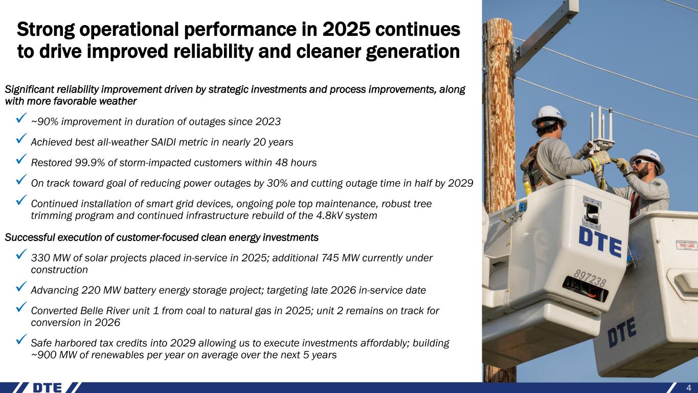 Continuing to deliver exceptional results for our stakeholders; well positioned for long-term growth 3 1. Refer to the appendix for information regarding the reconciliation of operating earnings (non-GAAP) to reported earnings ✓ Highly engaged team committed to delivering best-in-class results for our customers, communities and investors ✓ Achieving significant reliability improvements for our customers driven by strategic investments and process improvements ✓ Data center opportunities continue to progress • 1.4 GW Oracle data center (in plan) approved and construction started • Executed agreement with Google to serve 1 GW data center which will provide upside to current long-term plan; contracts submitted to MPSC for approval • Potential further capital upside to support data center customers in advanced discussions • Data centers drive significant affordability benefits for existing customers ✓ 2026 operating EPS1 guidance provides 6% - 8% growth over 2025 guidance midpoint; well positioned to achieve high end of the range due to RNG tax credits ✓ Long-term operating EPS growth rate target of 6% - 8% through 2030, with 2026 guidance midpoint as the base; confident we will reach the high end of the guidance range in each year driven by RNG tax credits and the flexibility they provide; additional data centers will provide upside to current plan