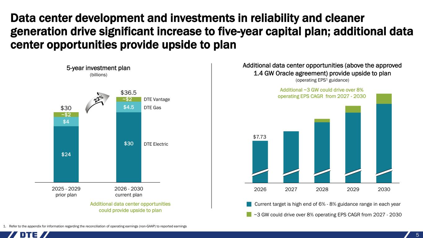 Strong operational performance in 2025 continues to drive improved reliability and cleaner generation Significant reliability improvement driven by strategic investments and process improvements, along with more favorable weather ✓ ~90% improvement in duration of outages since 2023 ✓ Achieved best all-weather SAIDI metric in nearly 20 years ✓ Restored 99.9% of storm-impacted customers within 48 hours ✓ On track toward goal of reducing power outages by 30% and cutting outage time in half by 2029 ✓ Continued installation of smart grid devices, ongoing pole top maintenance, robust tree trimming program and continued infrastructure rebuild of the 4.8kV system Successful execution of customer-focused clean energy investments ✓ 330 MW of solar projects placed in-service in 2025; additional 745 MW currently under construction ✓ Advancing 220 MW battery energy storage project; targeting late 2026 in-service date ✓ Converted Belle River unit 1 from coal to natural gas in 2025; unit 2 remains on track for conversion in 2026 ✓ Safe harbored tax credits into 2029 allowing us to execute investments affordably; building ~900 MW of renewables per year on average over the next 5 years 4