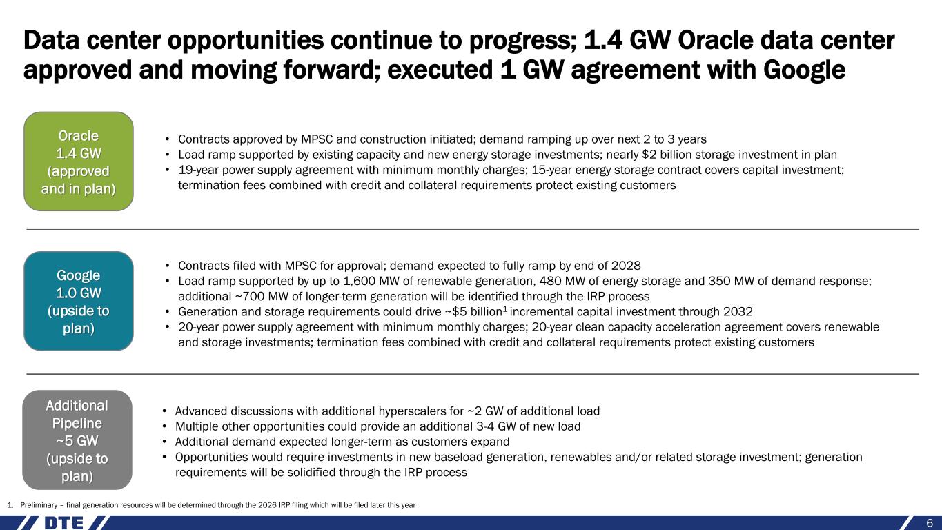 Data center development and investments in reliability and cleaner generation drive significant increase to five-year capital plan; additional data center opportunities provide upside to plan 5 1. Refer to the appendix for information regarding the reconciliation of operating earnings (non-GAAP) to reported earnings 2026 2027 2028 2029 2030 $7.73 Additional data center opportunities (above the approved 1.4 GW Oracle agreement) provide upside to plan (operating EPS1 guidance) ~3 GW could drive over 8% operating EPS CAGR from 2027 - 2030 Additional ~3 GW could drive over 8% operating EPS CAGR from 2027 - 2030 Current target is high end of 6% - 8% guidance range in each year $24 $4 ~$2 2025 - 2029 prior plan 2026 - 2030 current plan $30 $36.5 DTE Electric DTE Gas DTE Vantage22 % 5-year investment plan (billions) ~$2 $4.5 $30 Additional data center opportunities could provide upside to plan