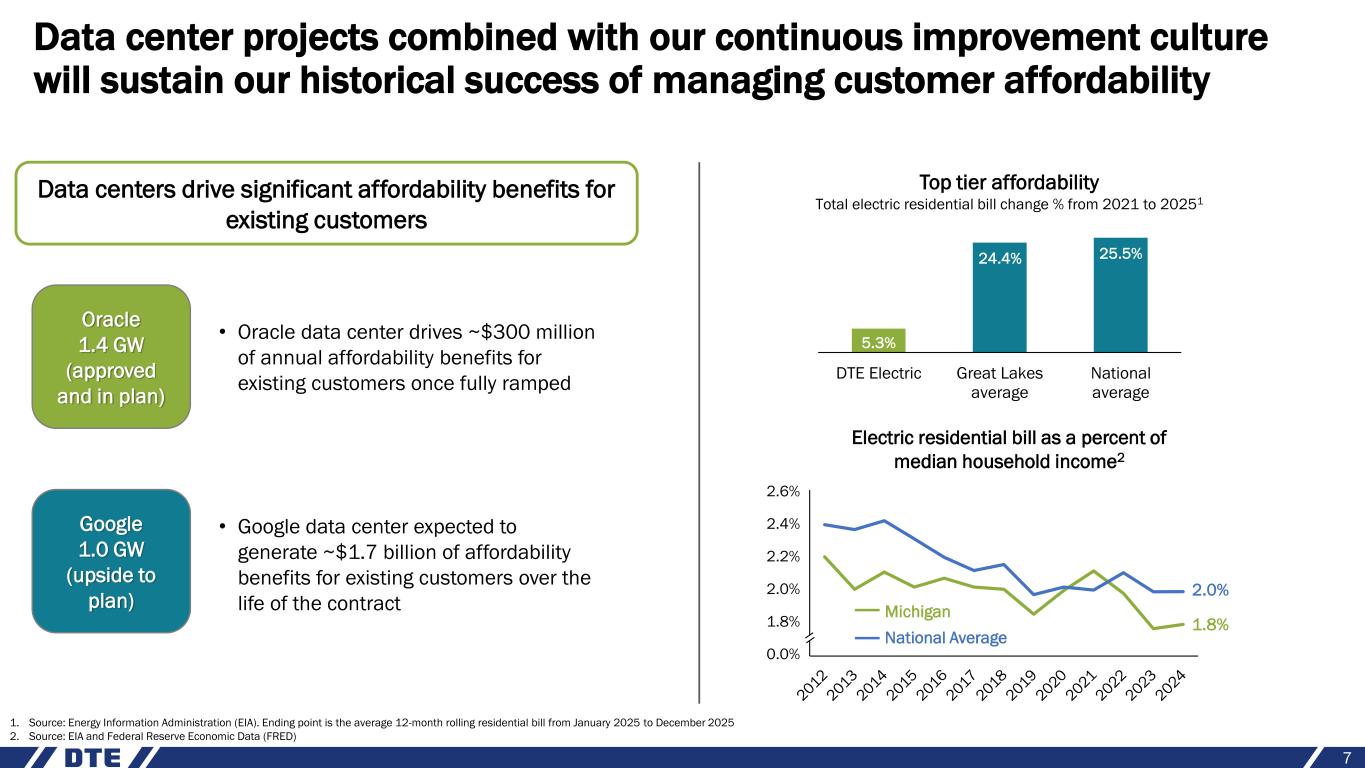 6 • Contracts approved by MPSC and construction initiated; demand ramping up over next 2 to 3 years • Load ramp supported by existing capacity and new energy storage investments; nearly $2 billion storage investment in plan • 19-year power supply agreement with minimum monthly charges; 15-year energy storage contract covers capital investment; termination fees combined with credit and collateral requirements protect existing customers Data center opportunities continue to progress; 1.4 GW Oracle data center approved and moving forward; executed 1 GW agreement with Google Oracle 1.4 GW (approved and in plan) Google 1.0 GW (upside to plan) Additional Pipeline ~5 GW (upside to plan) • Contracts filed with MPSC for approval; demand expected to fully ramp by end of 2028 • Load ramp supported by up to 1,600 MW of renewable generation, 480 MW of energy storage and 350 MW of demand response; additional ~700 MW of longer-term generation will be identified through the IRP process • Generation and storage requirements could drive ~$5 billion1 incremental capital investment through 2032 • 20-year power supply agreement with minimum monthly charges; 20-year clean capacity acceleration agreement covers renewable and storage investments; termination fees combined with credit and collateral requirements protect existing customers • Advanced discussions with additional hyperscalers for ~2 GW of additional load • Multiple other opportunities could provide an additional 3-4 GW of new load • Additional demand expected longer-term as customers expand • Opportunities would require investments in new baseload generation, renewables and/or related storage investment; generation requirements will be solidified through the IRP process 1. Preliminary – final generation resources will be determined through the 2026 IRP filing which will be filed later this year