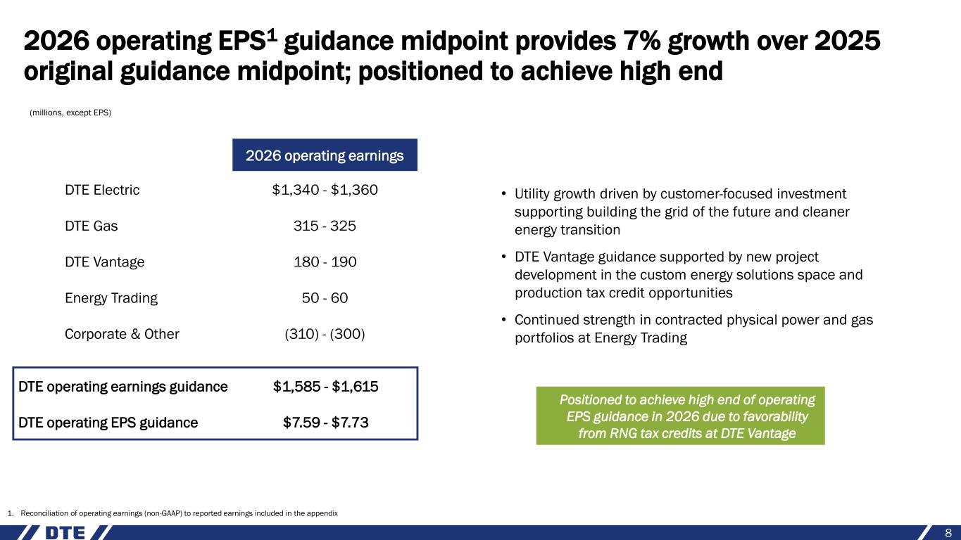 7 1. Source: Energy Information Administration (EIA). Ending point is the average 12-month rolling residential bill from January 2025 to December 2025 2. Source: EIA and Federal Reserve Economic Data (FRED) Data center projects combined with our continuous improvement culture will sustain our historical success of managing customer affordability Data centers drive significant affordability benefits for existing customers • Oracle data center drives ~$300 million of annual affordability benefits for existing customers once fully ramped Oracle 1.4 GW (approved and in plan) Google 1.0 GW (upside to plan) • Google data center expected to generate ~$1.7 billion of affordability benefits for existing customers over the life of the contract Top tier affordability Total electric residential bill change % from 2021 to 20251 Electric residential bill as a percent of median household income2 2.6% 0.0% 2.4% 2.2% 2.0% 1.8% Michigan National Average 2.0% 1.8% 5.3% 24.4% 25.5% DTE Electric Great Lakes average National average