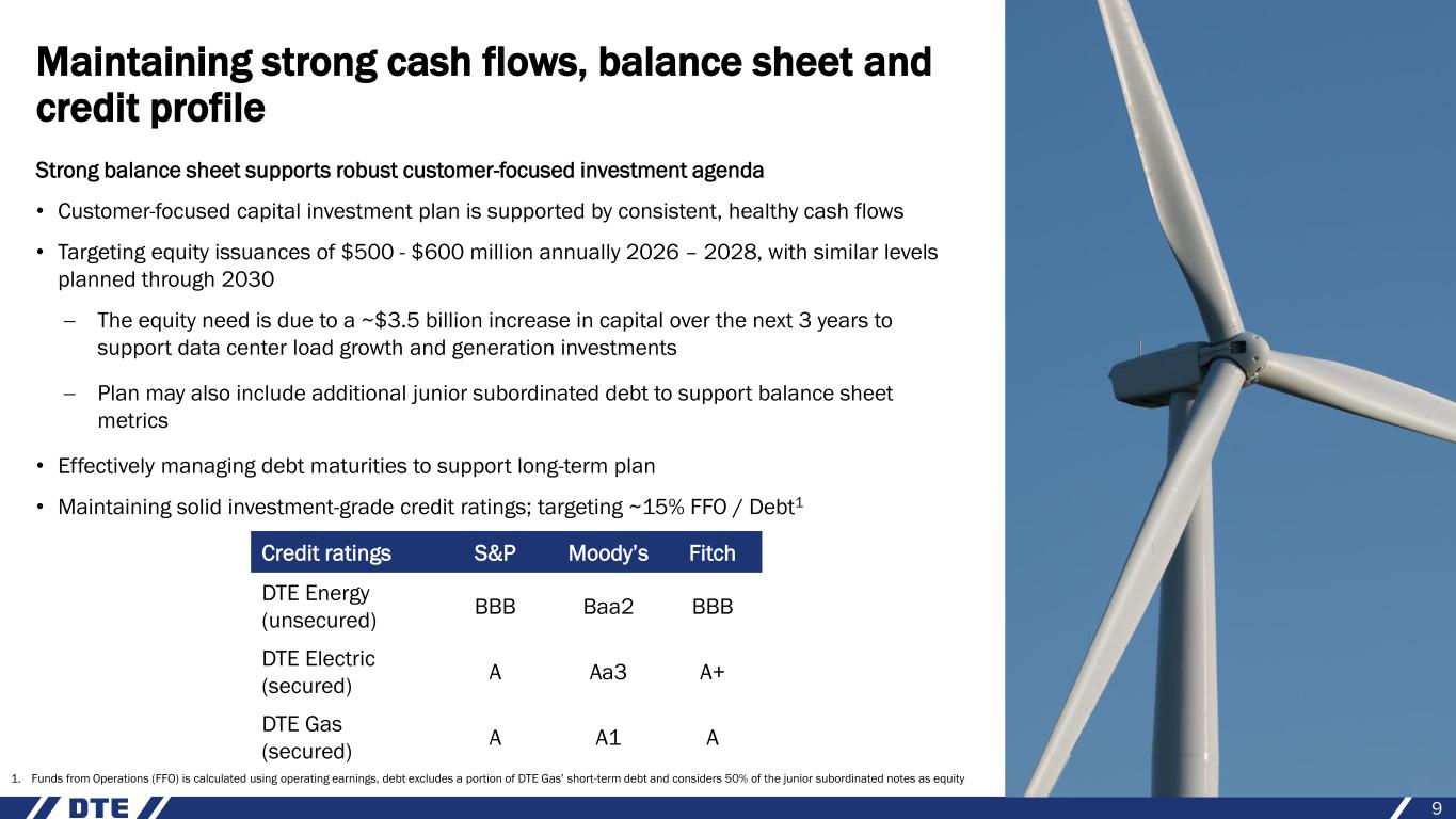2026 operating EPS1 guidance midpoint provides 7% growth over 2025 original guidance midpoint; positioned to achieve high end 8 (millions, except EPS) 2026 operating earnings DTE Electric $1,340 - $1,360 DTE Gas 315 - 325 DTE Vantage 180 - 190 Energy Trading 50 - 60 Corporate & Other (310) - (300) 1. Reconciliation of operating earnings (non-GAAP) to reported earnings included in the appendix Positioned to achieve high end of operating EPS guidance in 2026 due to favorability from RNG tax credits at DTE Vantage DTE operating earnings guidance $1,585 - $1,615 DTE operating EPS guidance $7.59 - $7.73 • Utility growth driven by customer-focused investment supporting building the grid of the future and cleaner energy transition • DTE Vantage guidance supported by new project development in the custom energy solutions space and production tax credit opportunities • Continued strength in contracted physical power and gas portfolios at Energy Trading