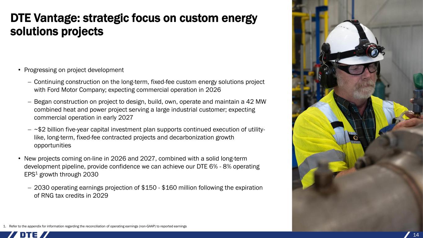 DTE Gas: replacing aging infrastructure to ensure reliability and safety for our customers 13 Gas renewal program Base infrastructure $1.5 $1.8 $2.5 $2.7 2025 - 2029 prior plan 2026 - 2030 current plan $4.0 $4.5 DTE Gas investment (billions) • Continuing to improve customer service excellence and progress on main renewal − Ongoing progress on main renewal program; renewed ~2,000 miles since program inception • Long-term capital investment plan focused on infrastructure improvements including main renewal investments to minimize leaks and reduce costs for our customers − Significant investment to support main renewal recovered through Infrastructure Recovery Mechanism (IRM) − Base infrastructure investments enhance distribution, transmission, compression and storage − Continued focus on safety and affordability for customers 2025-2029 currently includes potential 175M task at DTE Gas ~1 3%