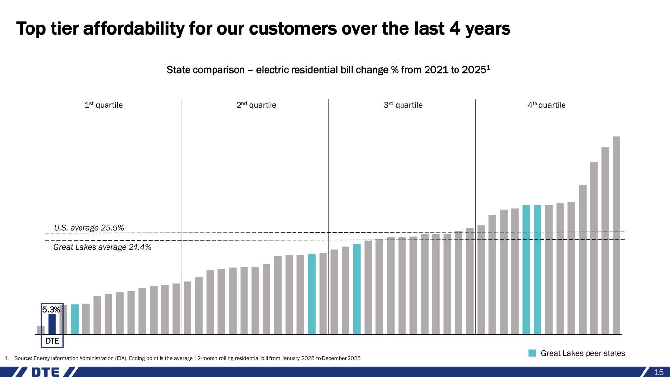 DTE Vantage: strategic focus on custom energy solutions projects 14 JN • Progressing on project development − Continuing construction on the long-term, fixed-fee custom energy solutions project with Ford Motor Company; expecting commercial operation in 2026 − Began construction on project to design, build, own, operate and maintain a 42 MW combined heat and power project serving a large industrial customer; expecting commercial operation in early 2027 − ~$2 billion five-year capital investment plan supports continued execution of utility- like, long-term, fixed-fee contracted projects and decarbonization growth opportunities • New projects coming on-line in 2026 and 2027, combined with a solid long-term development pipeline, provide confidence we can achieve our DTE 6% - 8% operating EPS1 growth through 2030 − 2030 operating earnings projection of $150 - $160 million following the expiration of RNG tax credits in 2029 1. Refer to the appendix for information regarding the reconciliation of operating earnings (non-GAAP) to reported earnings