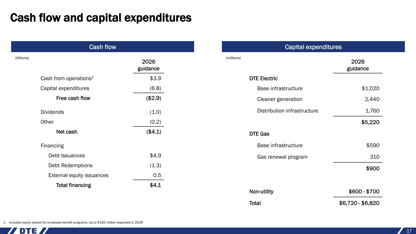Environmental, social and governance (ESG) efforts are key priorities; aspiring to be the best in the industry Environment • Transitioning towards net zero1 emissions at both utilities • Accelerating transition to cleaner generation • Protecting our natural resources Social • Focusing on the diversity, safety, well-being and success of employees • Investing in communities • Leader in volunteerism Governance • Focusing on the oversight of environmental sustainability, social and governance • Ensuring board diversity • Providing incentive plans tied to safety and customer satisfaction targets 16 1. Definition of net zero included in the appendix 2024 Sustainability Report https://empoweringmichigan.com/dte-impact/performance Link: