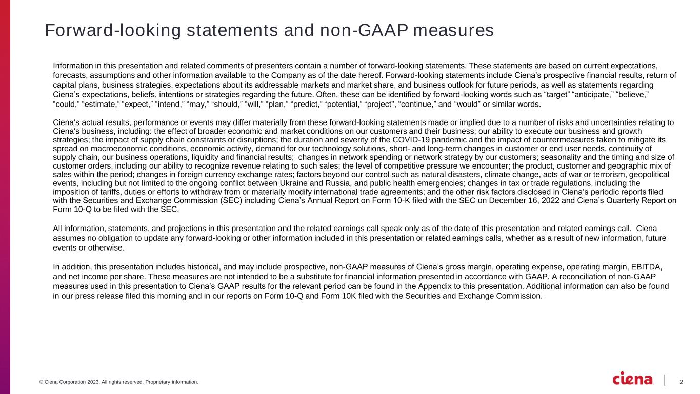 2© Ciena Corporation 2023. All rights reserved. Proprietary information. Forward-looking statements and non-GAAP measures Information in this presentation and related comments of presenters contain a number of forward-looking statements. These statements are based on current expectations, forecasts, assumptions and other information available to the Company as of the date hereof. Forward-looking statements include Ciena’s prospective financial results, return of capital plans, business strategies, expectations about its addressable markets and market share, and business outlook for future periods, as well as statements regarding Ciena’s expectations, beliefs, intentions or strategies regarding the future. Often, these can be identified by forward-looking words such as “target” “anticipate,” “believe,” “could,” “estimate,” “expect,” “intend,” “may,” “should,” “will,” “plan,” “predict,” “potential,” “project", “continue,” and “would” or similar words. Ciena's actual results, performance or events may differ materially from these forward-looking statements made or implied due to a number of risks and uncertainties relating to Ciena's business, including: the effect of broader economic and market conditions on our customers and their business; our ability to execute our business and growth strategies; the impact of supply chain constraints or disruptions; the duration and severity of the COVID-19 pandemic and the impact of countermeasures taken to mitigate its spread on macroeconomic conditions, economic activity, demand for our technology solutions, short- and long-term changes in customer or end user needs, continuity of supply chain, our business operations, liquidity and financial results; changes in network spending or network strategy by our customers; seasonality and the timing and size of customer orders, including our ability to recognize revenue relating to such sales; the level of competitive pressure we encounter; the product, customer and geographic mix of sales within the period; changes in foreign currency exchange rates; factors beyond our control such as natural disasters, climate change, acts of war or terrorism, geopolitical events, including but not limited to the ongoing conflict between Ukraine and Russia, and public health emergencies; changes in tax or trade regulations, including the imposition of tariffs, duties or efforts to withdraw from or materially modify international trade agreements; and the other risk factors disclosed in Ciena’s periodic reports filed with the Securities and Exchange Commission (SEC) including Ciena’s Annual Report on Form 10-K filed with the SEC on December 16, 2022 and Ciena’s Quarterly Report on Form 10-Q to be filed with the SEC. All information, statements, and projections in this presentation and the related earnings call speak only as of the date of this presentation and related earnings call. Ciena assumes no obligation to update any forward-looking or other information included in this presentation or related earnings calls, whether as a result of new information, future events or otherwise. In addition, this presentation includes historical, and may include prospective, non-GAAP measures of Ciena’s gross margin, operating expense, operating margin, EBITDA, and net income per share. These measures are not intended to be a substitute for financial information presented in accordance with GAAP. A reconciliation of non-GAAP measures used in this presentation to Ciena’s GAAP results for the relevant period can be found in the Appendix to this presentation. Additional information can also be found in our press release filed this morning and in our reports on Form 10-Q and Form 10K filed with the Securities and Exchange Commission.