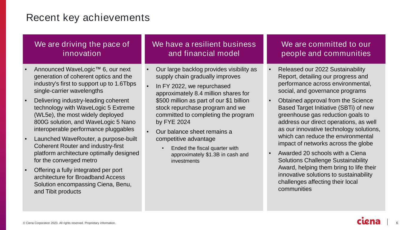 5© Ciena Corporation 2023. All rights reserved. Proprietary information. Ciena is an industry-leading global networking systems, services, and software company ….. Leading technology and innovation … with a strong track record of creating shareholder value Diversification and scale of business Leader in Optical markets and disruptor in emerging opportunities Demonstrated track record of financial performance Flexibility with strong balance sheet