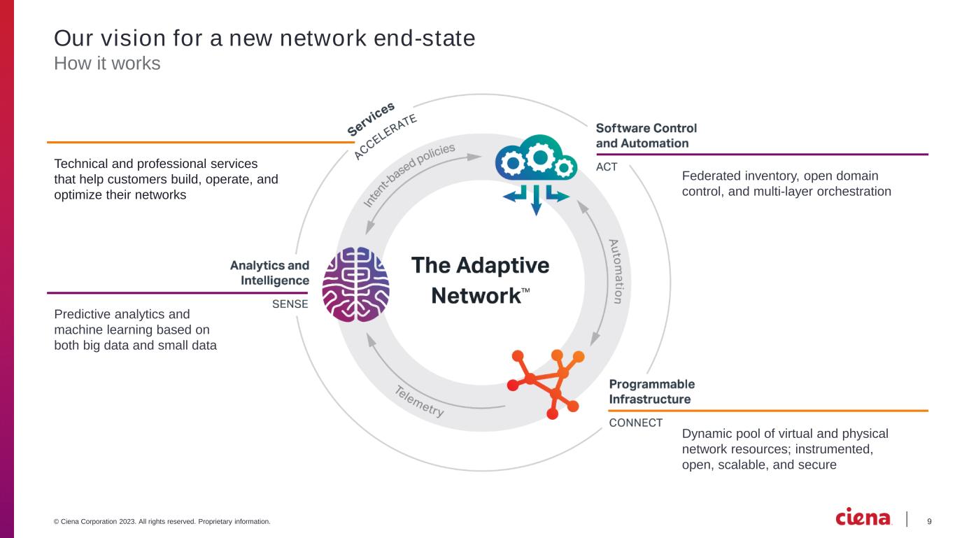 8© Ciena Corporation 2023. All rights reserved. Proprietary information. Six mega trends and the innovations that will enable them AI, Digital Transformation & Automation Cloud Data Center Mobility & 5G IoT and Connected Objects Virtual & Hybrid Lifestyles