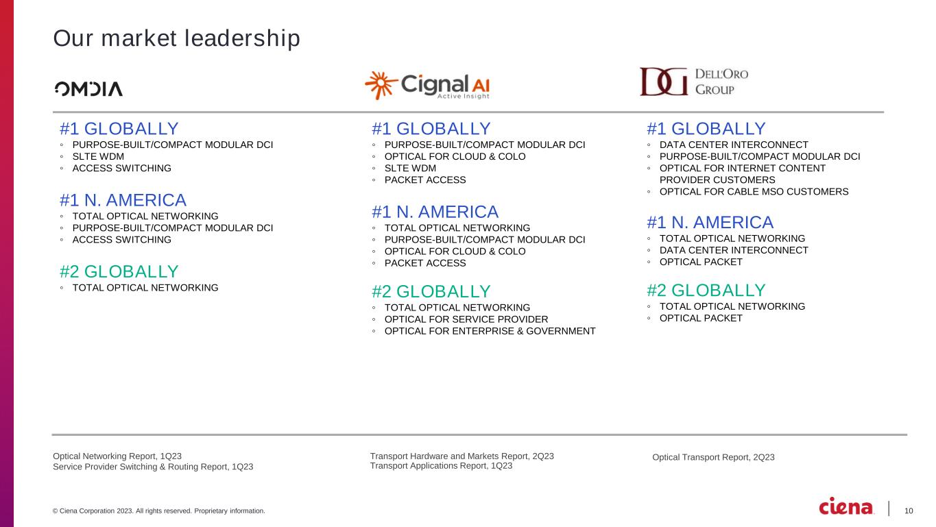 10© Ciena Corporation 2023. All rights reserved. Proprietary information. Our market leadership Optical Transport Report, 2Q23Optical Networking Report, 1Q23 Service Provider Switching & Routing Report, 1Q23 Transport Hardware and Markets Report, 2Q23 Transport Applications Report, 1Q23 #1 GLOBALLY ◦ DATA CENTER INTERCONNECT ◦ PURPOSE-BUILT/COMPACT MODULAR DCI ◦ OPTICAL FOR INTERNET CONTENT PROVIDER CUSTOMERS ◦ OPTICAL FOR CABLE MSO CUSTOMERS #1 N. AMERICA ◦ TOTAL OPTICAL NETWORKING ◦ DATA CENTER INTERCONNECT ◦ OPTICAL PACKET #2 GLOBALLY ◦ TOTAL OPTICAL NETWORKING ◦ OPTICAL PACKET #1 GLOBALLY ◦ PURPOSE-BUILT/COMPACT MODULAR DCI ◦ SLTE WDM ◦ ACCESS SWITCHING #1 N. AMERICA ◦ TOTAL OPTICAL NETWORKING ◦ PURPOSE-BUILT/COMPACT MODULAR DCI ◦ ACCESS SWITCHING #2 GLOBALLY ◦ TOTAL OPTICAL NETWORKING #1 GLOBALLY ◦ PURPOSE-BUILT/COMPACT MODULAR DCI ◦ OPTICAL FOR CLOUD & COLO ◦ SLTE WDM ◦ PACKET ACCESS #1 N. AMERICA ◦ TOTAL OPTICAL NETWORKING ◦ PURPOSE-BUILT/COMPACT MODULAR DCI ◦ OPTICAL FOR CLOUD & COLO ◦ PACKET ACCESS #2 GLOBALLY ◦ TOTAL OPTICAL NETWORKING ◦ OPTICAL FOR SERVICE PROVIDER ◦ OPTICAL FOR ENTERPRISE & GOVERNMENT