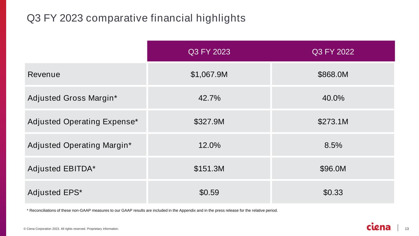 12© Ciena Corporation 2023. All rights reserved. Proprietary information. Q3 FY 2023 key highlights ▪ Non-telco represented a record high 46% of total revenue in fiscal Q3 2023 ◦ Direct Cloud Provider revenue increased 52% YoY ▪ Routing and Switching revenue increased 27% YoY in fiscal Q3 2023, reflecting strong contribution across the routing portfolio ▪ APAC revenue increased 31% YoY and EMEA revenue increased 23% YoY ▪ GAAP R&D investment was 18% of total revenue in fiscal Q3 2023 ▪ Record quarter in revenue and shipments of 6500 RLS driven by cloud and content provider network expansion • Expanding customer base for leading WaveLogic 5 Extreme 800G technology with 18 new WL5e customers added in quarter • Received first order for WaveLogic 6 ▪ Secured our first WaveRouter customer ▪ Continued to see increased customer traction adding 30+ new customers to the Routing and Switching portfolio, including new fiber broadband access customers and coherent metro routing customers ▪ Total shareholder return five-year CAGR of 10%1 ▪ Under our authorized $1 billion stock repurchase program, we repurchased $61M of shares in fiscal Q3 2023 and are targeting the repurchase of a total of $250M in shares in FY2023 1 Based on closing share price between 8/15//2018 to 8/15/2023 Achieving balanced growth Prioritizing long term shareholder value Driving the pace of innovation