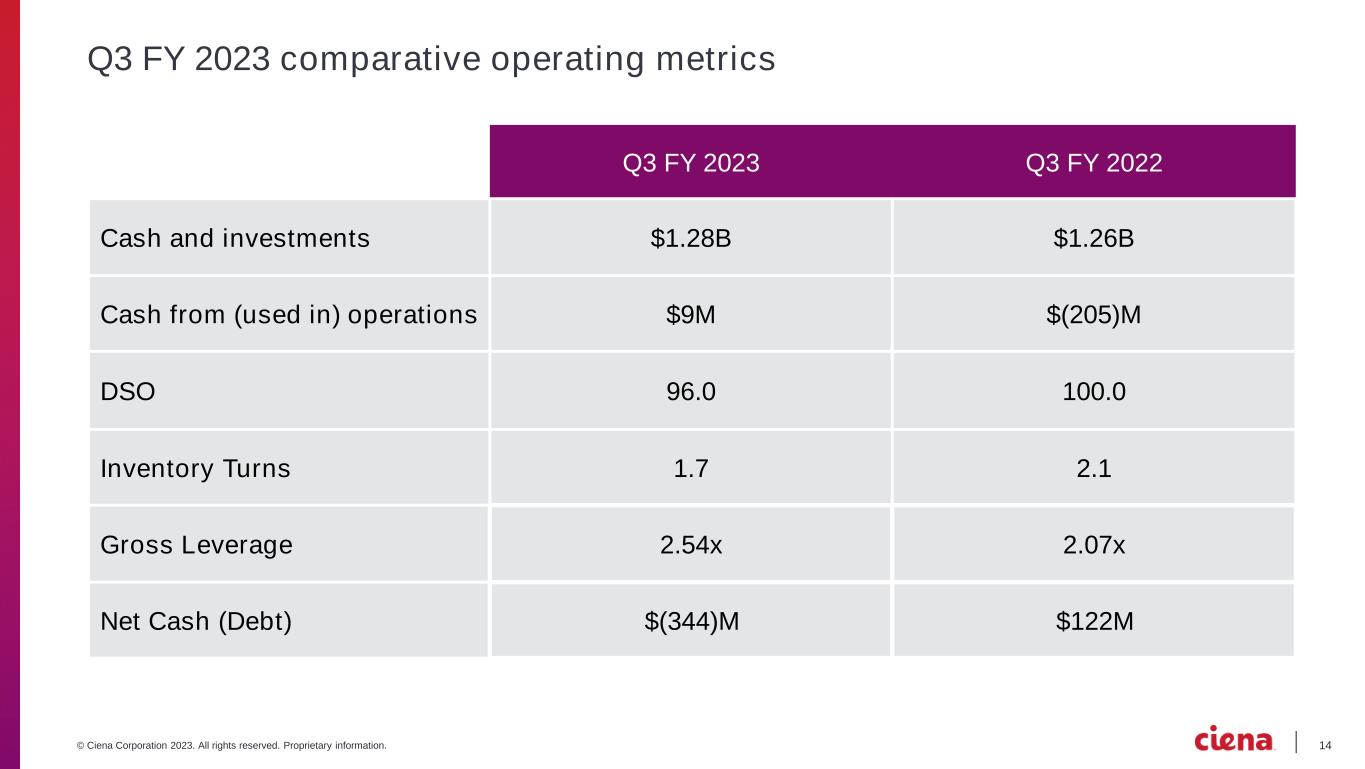 13© Ciena Corporation 2023. All rights reserved. Proprietary information. Q3 FY 2023 comparative financial highlights * Reconciliations of these non-GAAP measures to our GAAP results are included in the Appendix and in the press release for the relative period. Q3 FY 2023 Q3 FY 2022 Revenue $1,067.9M $868.0M Adjusted Gross Margin* 42.7% 40.0% Adjusted Operating Expense* $327.9M $273.1M Adjusted Operating Margin* 12.0% 8.5% Adjusted EBITDA* $151.3M $96.0M Adjusted EPS* $0.59 $0.33