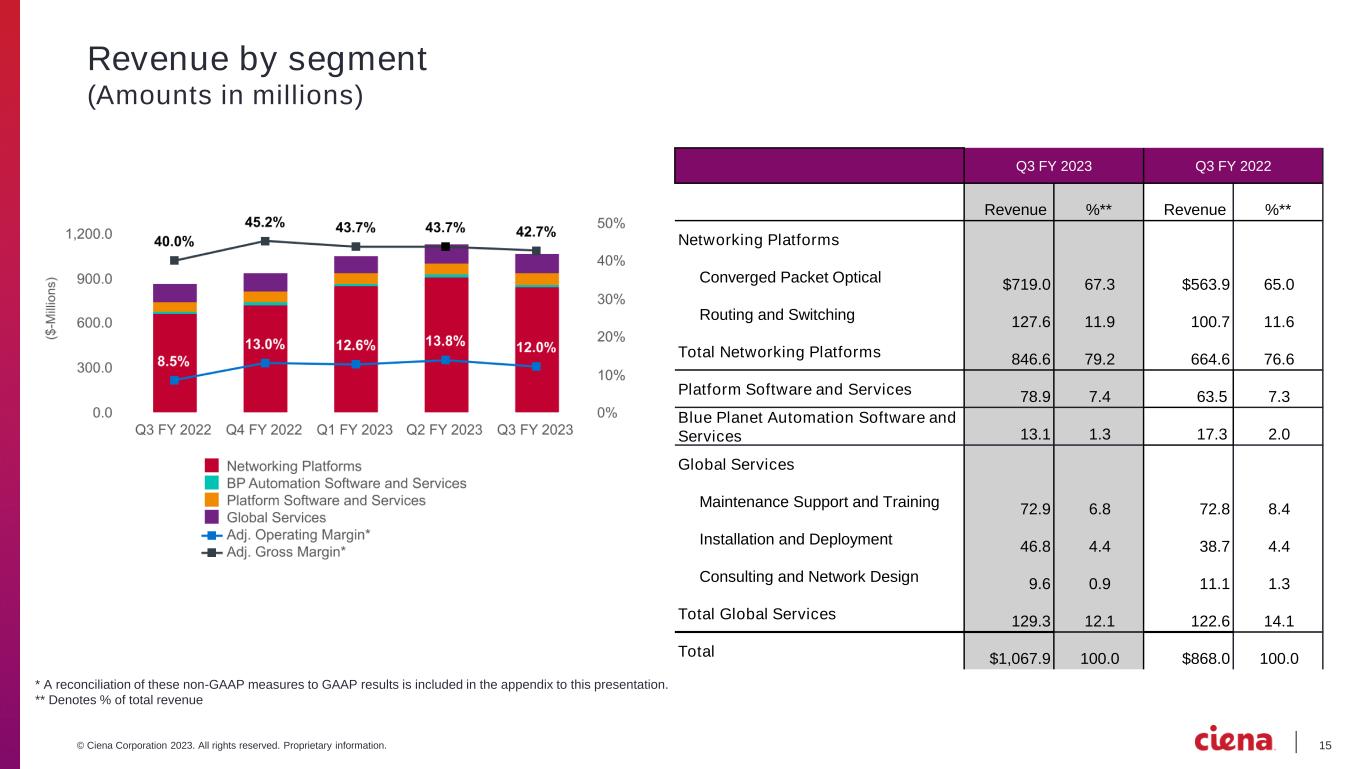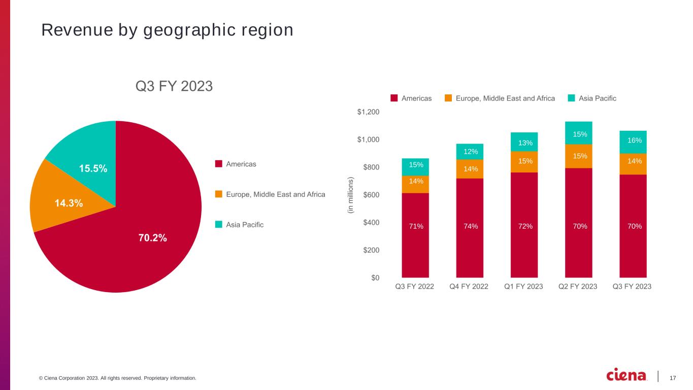 15© Ciena Corporation 2023. All rights reserved. Proprietary information. Revenue by segment (Amounts in millions) Q3 FY 2023 Q3 FY 2022 Revenue %** Revenue %** Networking Platforms Converged Packet Optical $719.0 67.3 $563.9 65.0 Routing and Switching 127.6 11.9 100.7 11.6 Total Networking Platforms 846.6 79.2 664.6 76.6 Platform Software and Services 78.9 7.4 63.5 7.3 Blue Planet Automation Software and Services 13.1 1.3 17.3 2.0 Global Services Maintenance Support and Training 72.9 6.8 72.8 8.4 Installation and Deployment 46.8 4.4 38.7 4.4 Consulting and Network Design 9.6 0.9 11.1 1.3 Total Global Services 129.3 12.1 122.6 14.1 Total $1,067.9 100.0 $868.0 100.0 * A reconciliation of these non-GAAP measures to GAAP results is included in the appendix to this presentation. ** Denotes % of total revenue
