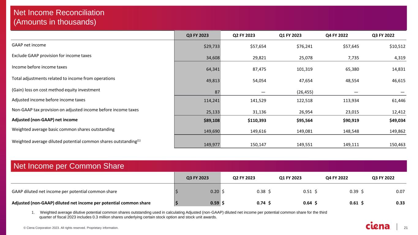 20© Ciena Corporation 2023. All rights reserved. Proprietary information. Q3 FY 2023 Q2 FY 2023 Q1 FY 2023 Q4 FY 2022 Q3 FY 2022 GAAP operating expense $370,727 $384,870 $370,730 $356,329 $313,672 Share-based compensation-research and development 10,954 10,731 9,234 8,507 8,233 Share-based compensation-sales and marketing 8,770 8,755 8,424 8,084 8,075 Share-based compensation-general and administrative 9,377 8,468 9,468 7,610 7,579 Significant asset impairments and restructuring costs 4,174 8,153 4,298 13,621 7,692 Amortization of intangible assets 9,487 9,845 7,441 5,754 8,919 Acquisition and integration costs 59 857 2,558 — 35 Total adjustments related to operating expense 42,821 46,809 41,423 43,576 40,533 Adjusted (non-GAAP) operating expense $327,906 $338,061 $329,307 $312,753 $273,139 Q3 FY 2023 Q2 FY 2023 Q1 FY 2023 Q4 FY 2022 Q3 FY 2022 GAAP income from operations $78,214 $102,813 $85,216 $77,268 $27,107 Total adjustments related to gross profit 6,992 7,245 6,231 4,978 6,082 Total adjustments related to operating expense 42,821 46,809 41,423 43,576 40,533 Total adjustments related to income from operations 49,813 54,054 47,654 48,554 46,615 Adjusted (non-GAAP) income from operations $128,027 $156,867 $132,870 $125,822 $73,722 Adjusted (non-GAAP) operating margin percentage 12.0 % 13.8 % 12.6 % 13.0 % 8.5 % Operating Expense Reconciliation (Amounts in thousands) Income from Operations Reconciliation (Amounts in thousands)