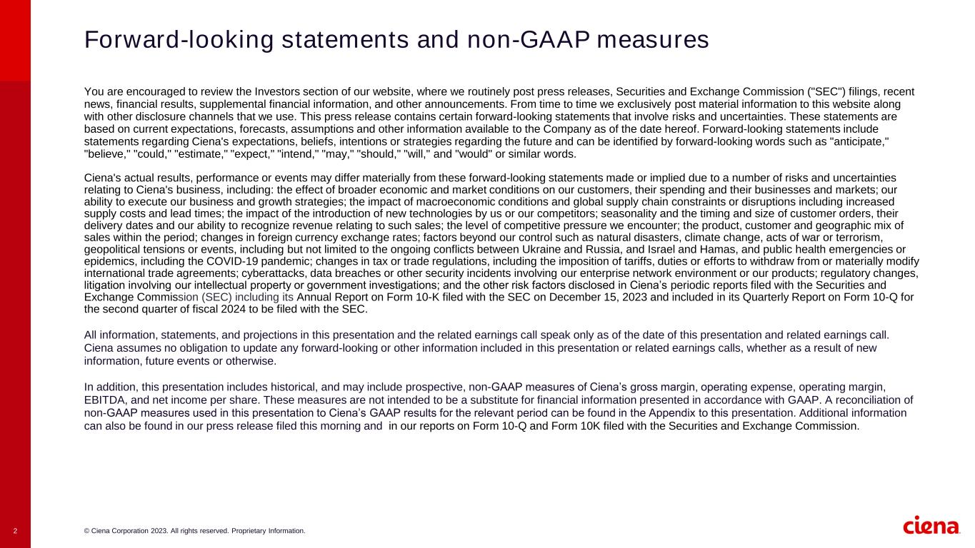© Ciena Corporation 2023. All rights reserved. Proprietary Information.2 Forward-looking statements and non-GAAP measures You are encouraged to review the Investors section of our website, where we routinely post press releases, Securities and Exchange Commission ("SEC") filings, recent news, financial results, supplemental financial information, and other announcements. From time to time we exclusively post material information to this website along with other disclosure channels that we use. This press release contains certain forward-looking statements that involve risks and uncertainties. These statements are based on current expectations, forecasts, assumptions and other information available to the Company as of the date hereof. Forward-looking statements include statements regarding Ciena's expectations, beliefs, intentions or strategies regarding the future and can be identified by forward-looking words such as "anticipate," "believe," "could," "estimate," "expect," "intend," "may," "should," "will," and "would" or similar words. Ciena's actual results, performance or events may differ materially from these forward-looking statements made or implied due to a number of risks and uncertainties relating to Ciena's business, including: the effect of broader economic and market conditions on our customers, their spending and their businesses and markets; our ability to execute our business and growth strategies; the impact of macroeconomic conditions and global supply chain constraints or disruptions including increased supply costs and lead times; the impact of the introduction of new technologies by us or our competitors; seasonality and the timing and size of customer orders, their delivery dates and our ability to recognize revenue relating to such sales; the level of competitive pressure we encounter; the product, customer and geographic mix of sales within the period; changes in foreign currency exchange rates; factors beyond our control such as natural disasters, climate change, acts of war or terrorism, geopolitical tensions or events, including but not limited to the ongoing conflicts between Ukraine and Russia, and Israel and Hamas, and public health emergencies or epidemics, including the COVID-19 pandemic; changes in tax or trade regulations, including the imposition of tariffs, duties or efforts to withdraw from or materially modify international trade agreements; cyberattacks, data breaches or other security incidents involving our enterprise network environment or our products; regulatory changes, litigation involving our intellectual property or government investigations; and the other risk factors disclosed in Ciena’s periodic reports filed with the Securities and Exchange Commission (SEC) including its Annual Report on Form 10-K filed with the SEC on December 15, 2023 and included in its Quarterly Report on Form 10-Q for the second quarter of fiscal 2024 to be filed with the SEC. All information, statements, and projections in this presentation and the related earnings call speak only as of the date of this presentation and related earnings call. Ciena assumes no obligation to update any forward-looking or other information included in this presentation or related earnings calls, whether as a result of new information, future events or otherwise. In addition, this presentation includes historical, and may include prospective, non-GAAP measures of Ciena’s gross margin, operating expense, operating margin, EBITDA, and net income per share. These measures are not intended to be a substitute for financial information presented in accordance with GAAP. A reconciliation of non-GAAP measures used in this presentation to Ciena’s GAAP results for the relevant period can be found in the Appendix to this presentation. Additional information can also be found in our press release filed this morning and in our reports on Form 10-Q and Form 10K filed with the Securities and Exchange Commission.