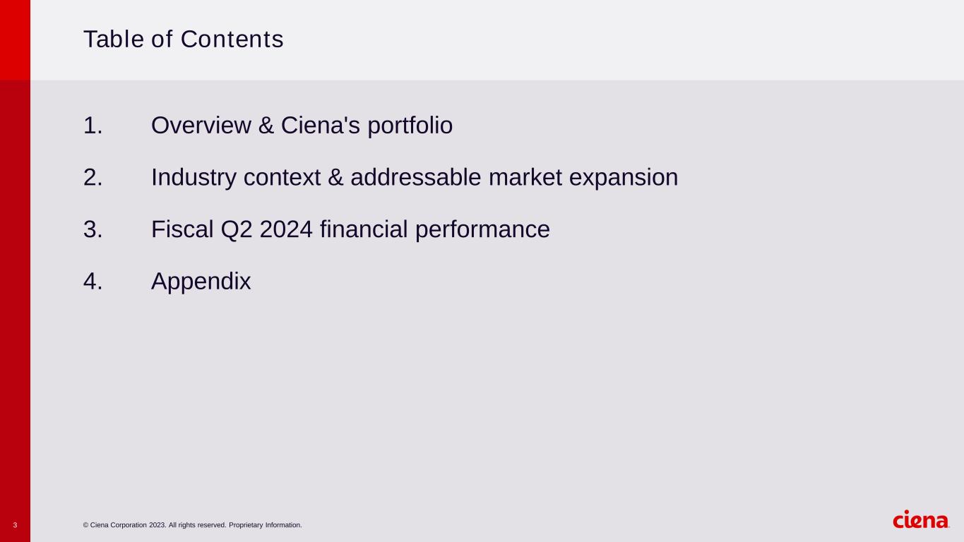 © Ciena Corporation 2023. All rights reserved. Proprietary Information.3 Table of Contents 1. Overview & Ciena's portfolio 2. Industry context & addressable market expansion 3. Fiscal Q2 2024 financial performance 4. Appendix