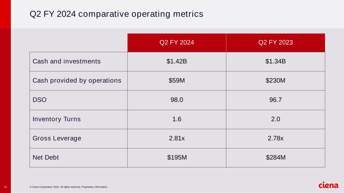 © Ciena Corporation 2023. All rights reserved. Proprietary Information.15 Q2 FY 2024 comparative financial highlights * Reconciliations of these non-GAAP measures to our GAAP results are included in the Appendix and in the press release for the relative period. Q2 FY 2024 Q2 FY 2023 Revenue $910.8M $1,132.7M Adjusted Gross Margin* 43.5% 43.7% Adjusted Operating Expense* $333.9M $338.1M Adjusted Operating Margin* 6.8% 13.8% Adjusted EBITDA* $85.8M $180.6M Adjusted EPS* $0.27 $0.74