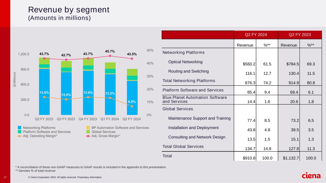 © Ciena Corporation 2023. All rights reserved. Proprietary Information.16 Q2 FY 2024 comparative operating metrics Q2 FY 2024 Q2 FY 2023 Cash and investments $1.42B $1.34B Cash provided by operations $59M $230M DSO 98.0 96.7 Inventory Turns 1.6 2.0 Gross Leverage 2.81x 2.78x Net Debt $195M $284M