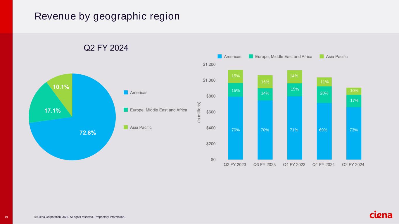 © Ciena Corporation 2023. All rights reserved. Proprietary Information.17 Revenue by segment (Amounts in millions) Q2 FY 2024 Q2 FY 2023 Revenue %** Revenue %** Networking Platforms Optical Networking $560.2 61.5 $784.5 69.3 Routing and Switching 116.1 12.7 130.4 11.5 Total Networking Platforms 676.3 74.2 914.9 80.8 Platform Software and Services 85.4 9.4 69.4 6.1 Blue Planet Automation Software and Services 14.4 1.6 20.6 1.8 Global Services Maintenance Support and Training 77.4 8.5 73.2 6.5 Installation and Deployment 43.8 4.8 39.5 3.5 Consulting and Network Design 13.5 1.5 15.1 1.3 Total Global Services 134.7 14.8 127.8 11.3 Total $910.8 100.0 $1,132.7 100.0 * A reconciliation of these non-GAAP measures to GAAP results is included in the appendix to this presentation. ** Denotes % of total revenue