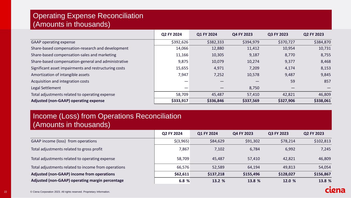 © Ciena Corporation 2023. All rights reserved. Proprietary Information.21 Q2 FY 2024 Q1 FY 2024 Q4 FY 2023 Q3 FY 2023 Q2 FY 2023 GAAP gross profit $388,661 $466,962 $486,281 $448,941 $487,683 Share-based compensation-products 1,760 1,318 1,194 1,118 1,155 Share-based compensation-services 3,344 3,020 2,827 2,687 2,659 Amortization of intangible assets 2,763 2,764 2,763 3,187 3,431 Total adjustments related to gross profit 7,867 7,102 6,784 6,992 7,245 Adjusted (non-GAAP) gross profit $396,528 $474,064 $493,065 $455,933 $494,928 Adjusted (non-GAAP) gross profit percentage 43.5 % 45.7 % 43.7 % 42.7 % 43.7 % Gross Profit Reconciliation (Amounts in thousands)