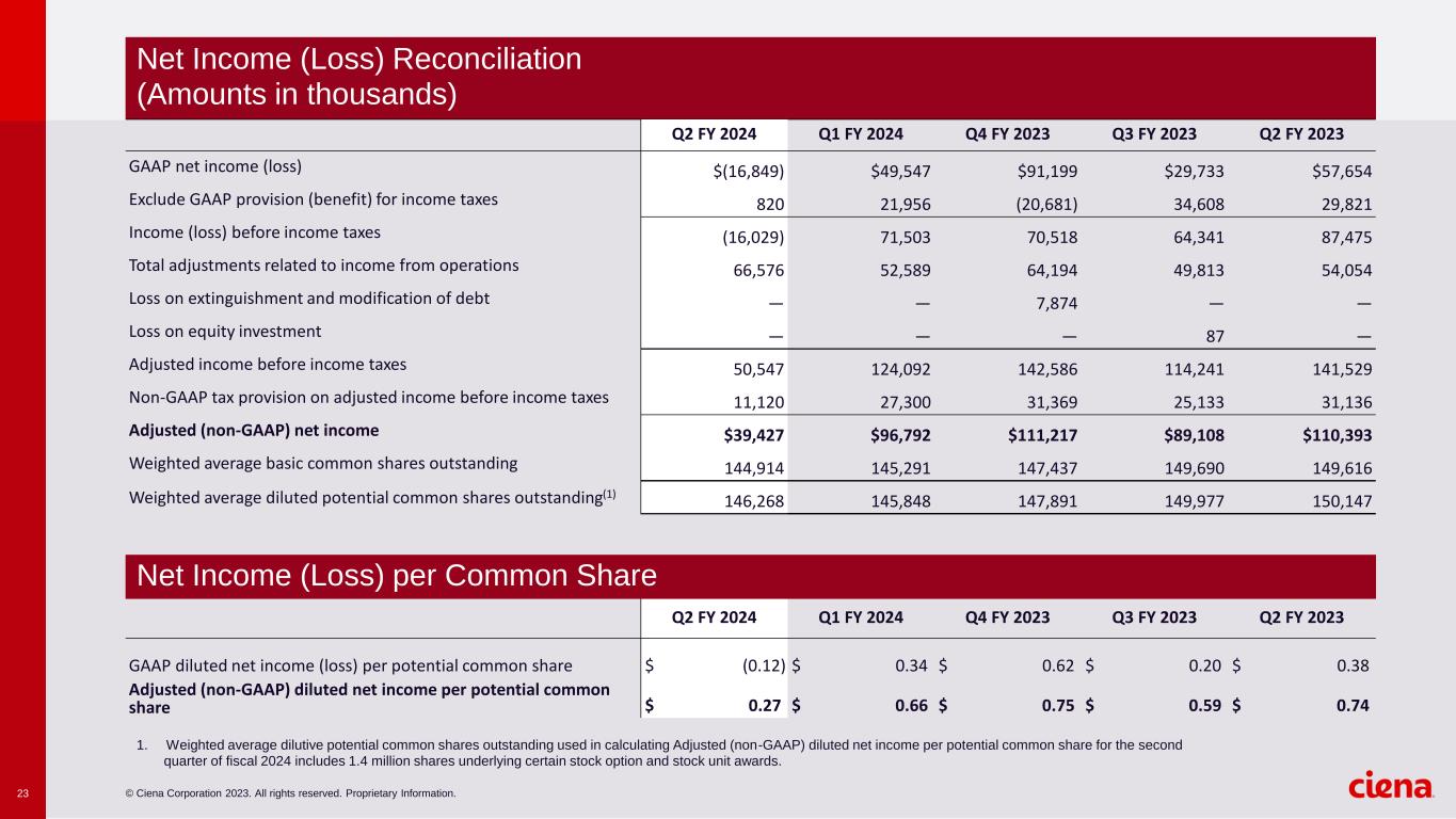 © Ciena Corporation 2023. All rights reserved. Proprietary Information.22 Q2 FY 2024 Q1 FY 2024 Q4 FY 2023 Q3 FY 2023 Q2 FY 2023 GAAP operating expense $392,626 $382,333 $394,979 $370,727 $384,870 Share-based compensation-research and development 14,066 12,880 11,412 10,954 10,731 Share-based compensation-sales and marketing 11,166 10,305 9,187 8,770 8,755 Share-based compensation-general and administrative 9,875 10,079 10,274 9,377 8,468 Significant asset impairments and restructuring costs 15,655 4,971 7,209 4,174 8,153 Amortization of intangible assets 7,947 7,252 10,578 9,487 9,845 Acquisition and integration costs — — — 59 857 Legal Settlement — — 8,750 — — Total adjustments related to operating expense 58,709 45,487 57,410 42,821 46,809 Adjusted (non-GAAP) operating expense $333,917 $336,846 $337,569 $327,906 $338,061 Q2 FY 2024 Q1 FY 2024 Q4 FY 2023 Q3 FY 2023 Q2 FY 2023 GAAP income (loss) from operations $(3,965) $84,629 $91,302 $78,214 $102,813 Total adjustments related to gross profit 7,867 7,102 6,784 6,992 7,245 Total adjustments related to operating expense 58,709 45,487 57,410 42,821 46,809 Total adjustments related to income from operations 66,576 52,589 64,194 49,813 54,054 Adjusted (non-GAAP) income from operations $62,611 $137,218 $155,496 $128,027 $156,867 Adjusted (non-GAAP) operating margin percentage 6.8 % 13.2 % 13.8 % 12.0 % 13.8 % Operating Expense Reconciliation (Amounts in thousands) Income (Loss) from Operations Reconciliation (Amounts in thousands)