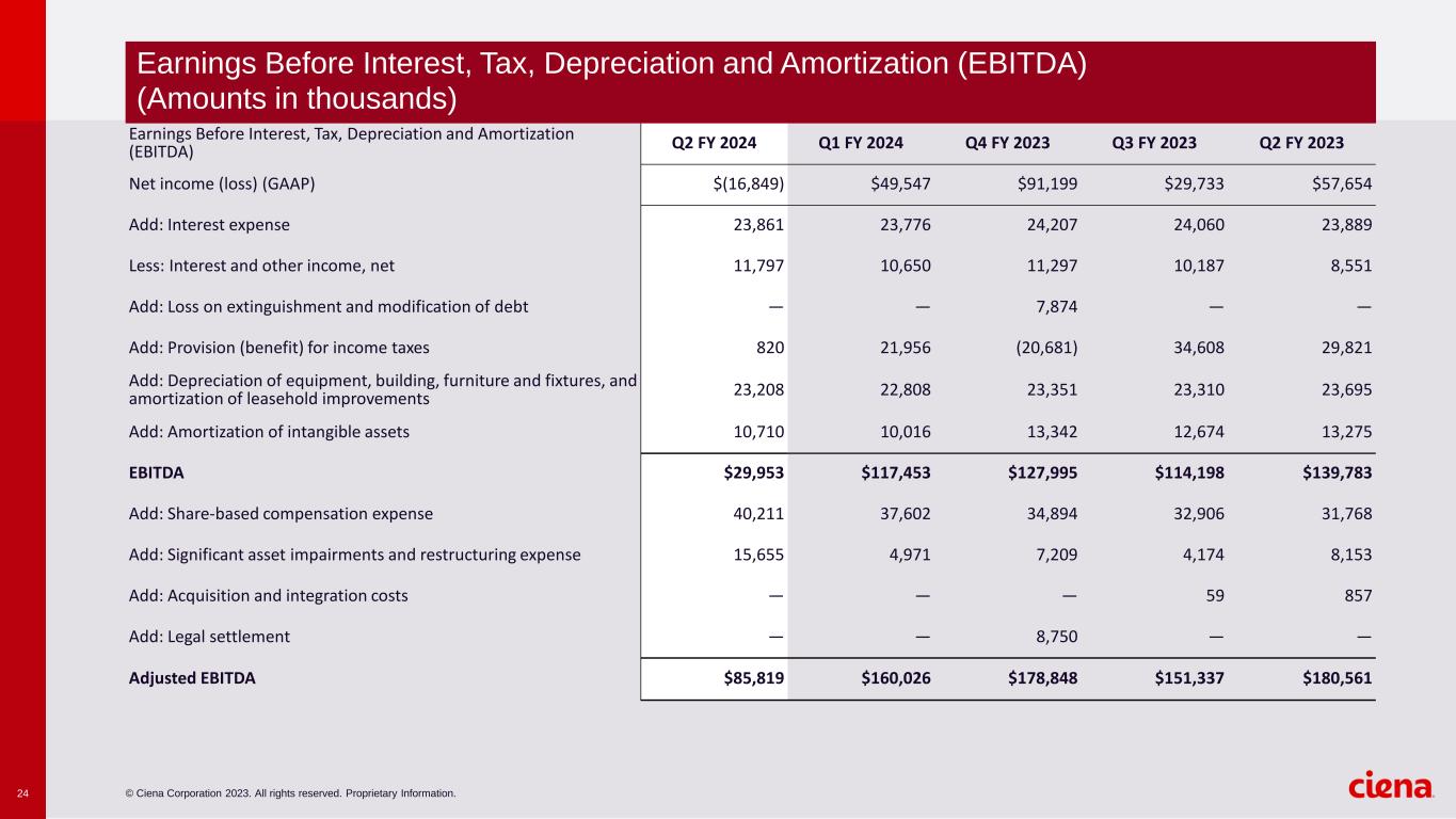 © Ciena Corporation 2023. All rights reserved. Proprietary Information.23 Q2 FY 2024 Q1 FY 2024 Q4 FY 2023 Q3 FY 2023 Q2 FY 2023 GAAP net income (loss) $(16,849) $49,547 $91,199 $29,733 $57,654 Exclude GAAP provision (benefit) for income taxes 820 21,956 (20,681) 34,608 29,821 Income (loss) before income taxes (16,029) 71,503 70,518 64,341 87,475 Total adjustments related to income from operations 66,576 52,589 64,194 49,813 54,054 Loss on extinguishment and modification of debt — — 7,874 — — Loss on equity investment — — — 87 — Adjusted income before income taxes 50,547 124,092 142,586 114,241 141,529 Non-GAAP tax provision on adjusted income before income taxes 11,120 27,300 31,369 25,133 31,136 Adjusted (non-GAAP) net income $39,427 $96,792 $111,217 $89,108 $110,393 Weighted average basic common shares outstanding 144,914 145,291 147,437 149,690 149,616 Weighted average diluted potential common shares outstanding(1) 146,268 145,848 147,891 149,977 150,147 Q2 FY 2024 Q1 FY 2024 Q4 FY 2023 Q3 FY 2023 Q2 FY 2023 GAAP diluted net income (loss) per potential common share $ (0.12) $ 0.34 $ 0.62 $ 0.20 $ 0.38 Adjusted (non-GAAP) diluted net income per potential common share $ 0.27 $ 0.66 $ 0.75 $ 0.59 $ 0.74 1. Weighted average dilutive potential common shares outstanding used in calculating Adjusted (non-GAAP) diluted net income per potential common share for the second quarter of fiscal 2024 includes 1.4 million shares underlying certain stock option and stock unit awards. Net Income (Loss) Reconciliation (Amounts in thousands) Net Income (Loss) per Common Share