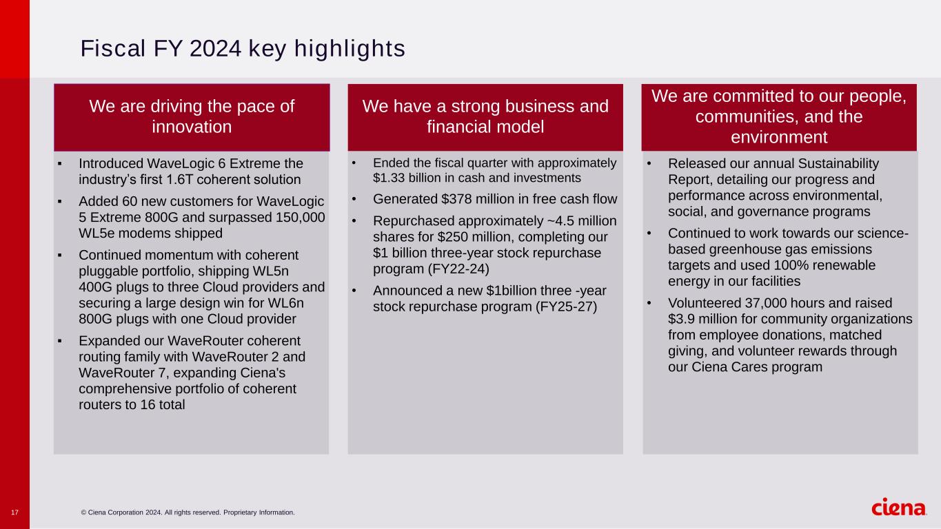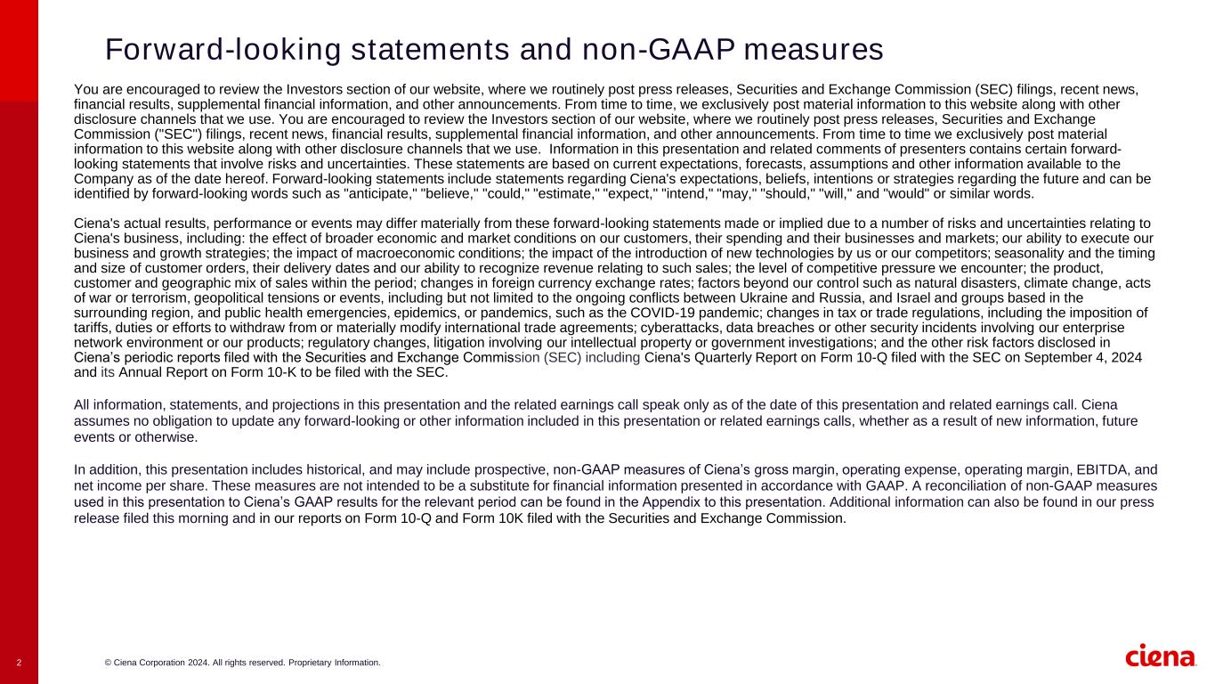 © Ciena Corporation 2024. All rights reserved. Proprietary Information.2 Forward-looking statements and non-GAAP measures You are encouraged to review the Investors section of our website, where we routinely post press releases, Securities and Exchange Commission (SEC) filings, recent news, financial results, supplemental financial information, and other announcements. From time to time, we exclusively post material information to this website along with other disclosure channels that we use. You are encouraged to review the Investors section of our website, where we routinely post press releases, Securities and Exchange Commission ("SEC") filings, recent news, financial results, supplemental financial information, and other announcements. From time to time we exclusively post material information to this website along with other disclosure channels that we use. Information in this presentation and related comments of presenters contains certain forward- looking statements that involve risks and uncertainties. These statements are based on current expectations, forecasts, assumptions and other information available to the Company as of the date hereof. Forward-looking statements include statements regarding Ciena's expectations, beliefs, intentions or strategies regarding the future and can be identified by forward-looking words such as "anticipate," "believe," "could," "estimate," "expect," "intend," "may," "should," "will," and "would" or similar words. Ciena's actual results, performance or events may differ materially from these forward-looking statements made or implied due to a number of risks and uncertainties relating to Ciena's business, including: the effect of broader economic and market conditions on our customers, their spending and their businesses and markets; our ability to execute our business and growth strategies; the impact of macroeconomic conditions; the impact of the introduction of new technologies by us or our competitors; seasonality and the timing and size of customer orders, their delivery dates and our ability to recognize revenue relating to such sales; the level of competitive pressure we encounter; the product, customer and geographic mix of sales within the period; changes in foreign currency exchange rates; factors beyond our control such as natural disasters, climate change, acts of war or terrorism, geopolitical tensions or events, including but not limited to the ongoing conflicts between Ukraine and Russia, and Israel and groups based in the surrounding region, and public health emergencies, epidemics, or pandemics, such as the COVID-19 pandemic; changes in tax or trade regulations, including the imposition of tariffs, duties or efforts to withdraw from or materially modify international trade agreements; cyberattacks, data breaches or other security incidents involving our enterprise network environment or our products; regulatory changes, litigation involving our intellectual property or government investigations; and the other risk factors disclosed in Ciena’s periodic reports filed with the Securities and Exchange Commission (SEC) including Ciena's Quarterly Report on Form 10-Q filed with the SEC on September 4, 2024 and its Annual Report on Form 10-K to be filed with the SEC. All information, statements, and projections in this presentation and the related earnings call speak only as of the date of this presentation and related earnings call. Ciena assumes no obligation to update any forward-looking or other information included in this presentation or related earnings calls, whether as a result of new information, future events or otherwise. In addition, this presentation includes historical, and may include prospective, non-GAAP measures of Ciena’s gross margin, operating expense, operating margin, EBITDA, and net income per share. These measures are not intended to be a substitute for financial information presented in accordance with GAAP. A reconciliation of non-GAAP measures used in this presentation to Ciena’s GAAP results for the relevant period can be found in the Appendix to this presentation. Additional information can also be found in our press release filed this morning and in our reports on Form 10-Q and Form 10K filed with the Securities and Exchange Commission.