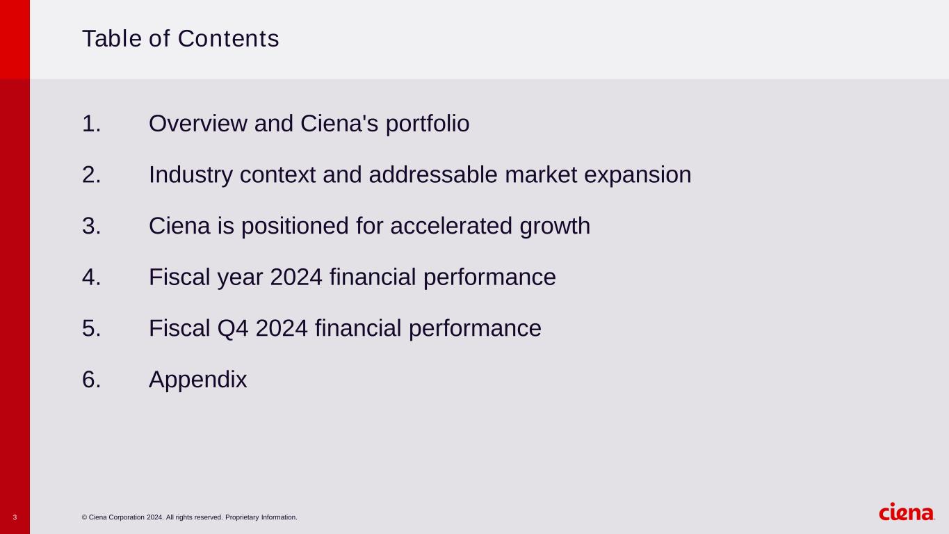 © Ciena Corporation 2024. All rights reserved. Proprietary Information.3 Table of Contents 1. Overview and Ciena's portfolio 2. Industry context and addressable market expansion 3. Ciena is positioned for accelerated growth 4. Fiscal year 2024 financial performance 5. Fiscal Q4 2024 financial performance 6. Appendix