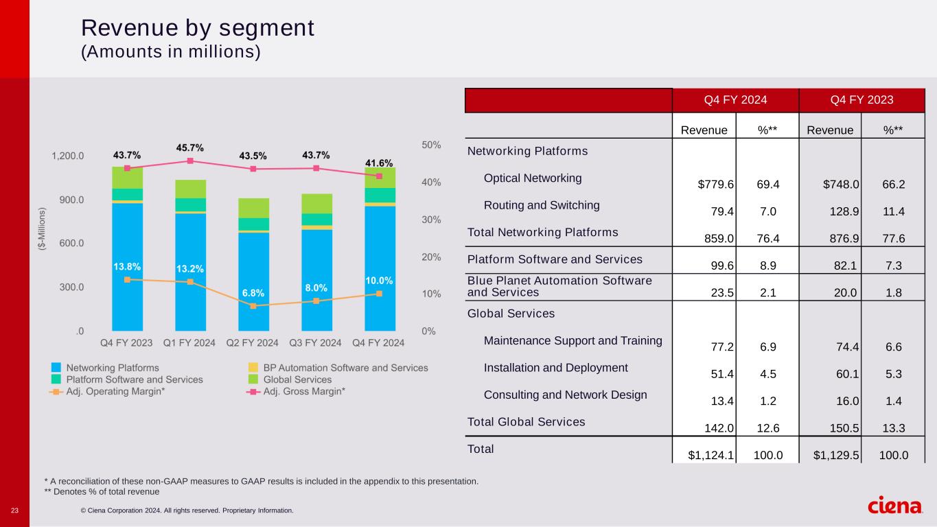© Ciena Corporation 2024. All rights reserved. Proprietary Information.23 Revenue by segment (Amounts in millions) Q4 FY 2024 Q4 FY 2023 Revenue %** Revenue %** Networking Platforms Optical Networking $779.6 69.4 $748.0 66.2 Routing and Switching 79.4 7.0 128.9 11.4 Total Networking Platforms 859.0 76.4 876.9 77.6 Platform Software and Services 99.6 8.9 82.1 7.3 Blue Planet Automation Software and Services 23.5 2.1 20.0 1.8 Global Services Maintenance Support and Training 77.2 6.9 74.4 6.6 Installation and Deployment 51.4 4.5 60.1 5.3 Consulting and Network Design 13.4 1.2 16.0 1.4 Total Global Services 142.0 12.6 150.5 13.3 Total $1,124.1 100.0 $1,129.5 100.0 * A reconciliation of these non-GAAP measures to GAAP results is included in the appendix to this presentation. ** Denotes % of total revenue