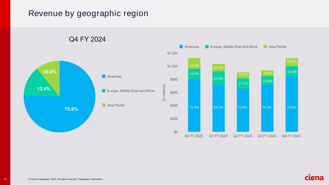 © Ciena Corporation 2024. All rights reserved. Proprietary Information.25 Revenue by geographic region 14.5% 10.8% 9.4%14.5% 20.0% 14.3% 71.0% 69.2% 72.8% 76.3% 17.1% 10.1% 10.8% 13.4% 75.8%