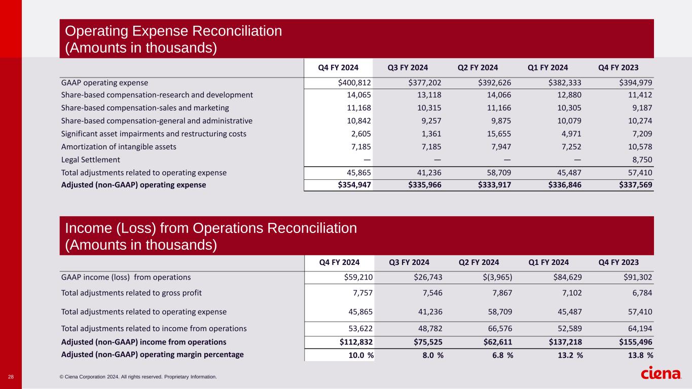 © Ciena Corporation 2024. All rights reserved. Proprietary Information.27 Q4 FY 2024 Q3 FY 2024 Q2 FY 2024 Q1 FY 2024 Q4 FY 2023 GAAP gross profit $460,022 $403,945 $388,661 $466,962 $486,281 Share-based compensation-products 1,736 1,660 1,760 1,318 1,194 Share-based compensation-services 3,257 3,122 3,344 3,020 2,827 Amortization of intangible assets 2,764 2,764 2,763 2,764 2,763 Total adjustments related to gross profit 7,757 7,546 7,867 7,102 6,784 Adjusted (non-GAAP) gross profit $467,779 $411,491 $396,528 $474,064 $493,065 Adjusted (non-GAAP) gross profit percentage 41.6 % 43.7 % 43.5 % 45.7 % 43.7 % Gross Profit Reconciliation (Amounts in thousands)