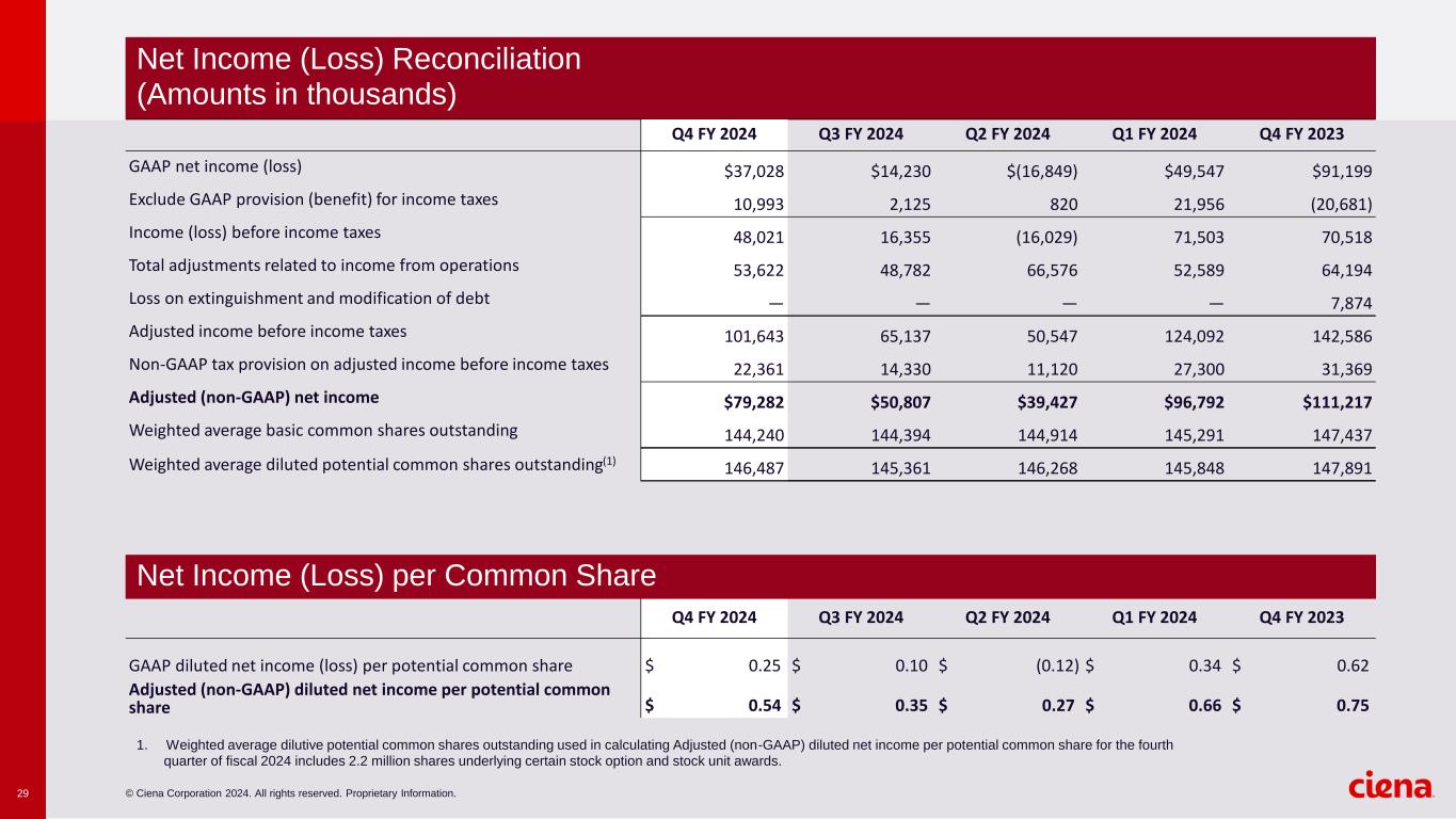 © Ciena Corporation 2024. All rights reserved. Proprietary Information.29 Q4 FY 2024 Q3 FY 2024 Q2 FY 2024 Q1 FY 2024 Q4 FY 2023 GAAP net income (loss) $37,028 $14,230 $(16,849) $49,547 $91,199 Exclude GAAP provision (benefit) for income taxes 10,993 2,125 820 21,956 (20,681) Income (loss) before income taxes 48,021 16,355 (16,029) 71,503 70,518 Total adjustments related to income from operations 53,622 48,782 66,576 52,589 64,194 Loss on extinguishment and modification of debt — — — — 7,874 Adjusted income before income taxes 101,643 65,137 50,547 124,092 142,586 Non-GAAP tax provision on adjusted income before income taxes 22,361 14,330 11,120 27,300 31,369 Adjusted (non-GAAP) net income $79,282 $50,807 $39,427 $96,792 $111,217 Weighted average basic common shares outstanding 144,240 144,394 144,914 145,291 147,437 Weighted average diluted potential common shares outstanding(1) 146,487 145,361 146,268 145,848 147,891 Q4 FY 2024 Q3 FY 2024 Q2 FY 2024 Q1 FY 2024 Q4 FY 2023 GAAP diluted net income (loss) per potential common share $ 0.25 $ 0.10 $ (0.12) $ 0.34 $ 0.62 Adjusted (non-GAAP) diluted net income per potential common share $ 0.54 $ 0.35 $ 0.27 $ 0.66 $ 0.75 1. Weighted average dilutive potential common shares outstanding used in calculating Adjusted (non-GAAP) diluted net income per potential common share for the fourth quarter of fiscal 2024 includes 2.2 million shares underlying certain stock option and stock unit awards. Net Income (Loss) Reconciliation (Amounts in thousands) Net Income (Loss) per Common Share