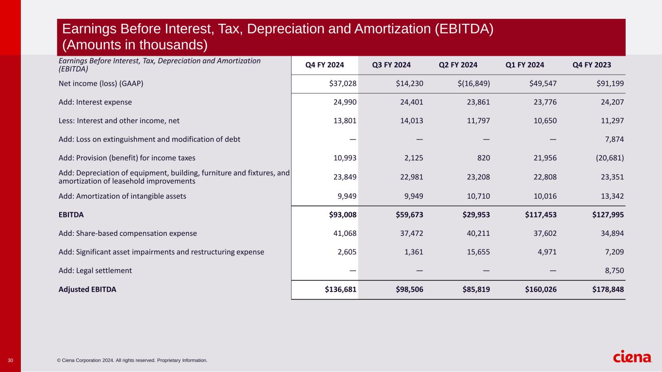 © Ciena Corporation 2024. All rights reserved. Proprietary Information.30 Earnings Before Interest, Tax, Depreciation and Amortization (EBITDA) Q4 FY 2024 Q3 FY 2024 Q2 FY 2024 Q1 FY 2024 Q4 FY 2023 Net income (loss) (GAAP) $37,028 $14,230 $(16,849) $49,547 $91,199 Add: Interest expense 24,990 24,401 23,861 23,776 24,207 Less: Interest and other income, net 13,801 14,013 11,797 10,650 11,297 Add: Loss on extinguishment and modification of debt — — — — 7,874 Add: Provision (benefit) for income taxes 10,993 2,125 820 21,956 (20,681) Add: Depreciation of equipment, building, furniture and fixtures, and amortization of leasehold improvements 23,849 22,981 23,208 22,808 23,351 Add: Amortization of intangible assets 9,949 9,949 10,710 10,016 13,342 EBITDA $93,008 $59,673 $29,953 $117,453 $127,995 Add: Share-based compensation expense 41,068 37,472 40,211 37,602 34,894 Add: Significant asset impairments and restructuring expense 2,605 1,361 15,655 4,971 7,209 Add: Legal settlement — — — — 8,750 Adjusted EBITDA $136,681 $98,506 $85,819 $160,026 $178,848 Earnings Before Interest, Tax, Depreciation and Amortization (EBITDA) (Amounts in thousands)