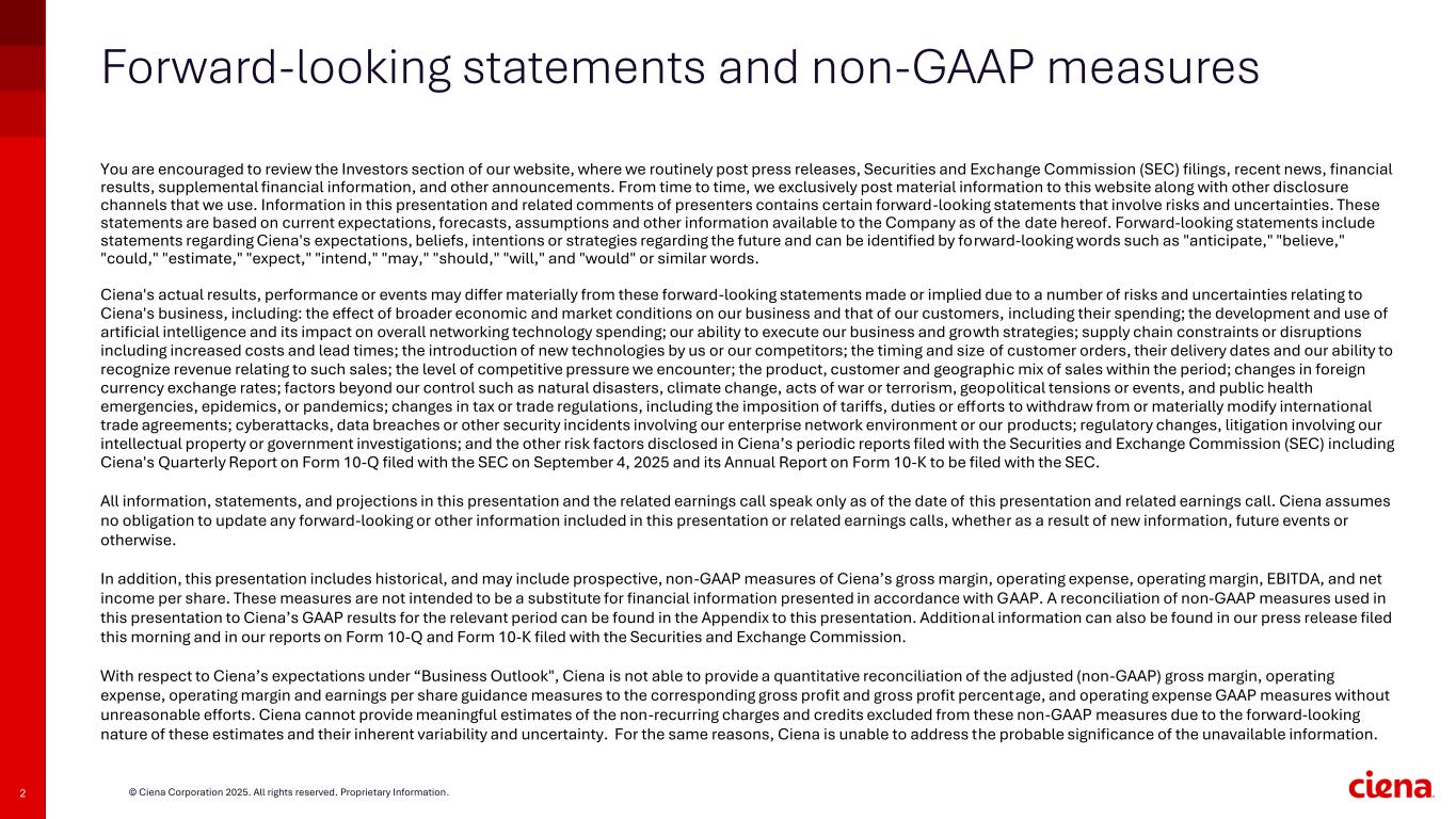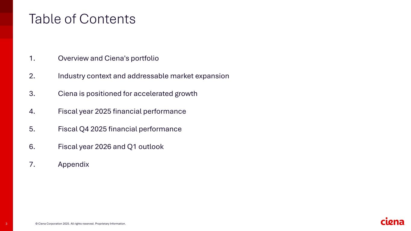 2 © Ciena Corporation 2025. All rights reserved. Proprietary Information. Forward-looking statements and non-GAAP measures You are encouraged to review the Investors section of our website, where we routinely post press releases, Securities and Exchange Commission (SEC) filings, recent news, financial results, supplemental financial information, and other announcements. From time to time, we exclusively post material information to this website along with other disclosure channels that we use. Information in this presentation and related comments of presenters contains certain forward-looking statements that involve risks and uncertainties. These statements are based on current expectations, forecasts, assumptions and other information available to the Company as of the date hereof. Forward-looking statements include statements regarding Ciena's expectations, beliefs, intentions or strategies regarding the future and can be identified by forward-looking words such as "anticipate," "believe," "could," "estimate," "expect," "intend," "may," "should," "will," and "would" or similar words. Ciena's actual results, performance or events may differ materially from these forward-looking statements made or implied due to a number of risks and uncertainties relating to Ciena's business, including: the effect of broader economic and market conditions on our business and that of our customers, including their spending; the development and use of artificial intelligence and its impact on overall networking technology spending; our ability to execute our business and growth strategies; supply chain constraints or disruptions including increased costs and lead times; the introduction of new technologies by us or our competitors; the timing and size of customer orders, their delivery dates and our ability to recognize revenue relating to such sales; the level of competitive pressure we encounter; the product, customer and geographic mix of sales within the period; changes in foreign currency exchange rates; factors beyond our control such as natural disasters, climate change, acts of war or terrorism, geopolitical tensions or events, and public health emergencies, epidemics, or pandemics; changes in tax or trade regulations, including the imposition of tariffs, duties or efforts to withdraw from or materially modify international trade agreements; cyberattacks, data breaches or other security incidents involving our enterprise network environment or our products; regulatory changes, litigation involving our intellectual property or government investigations; and the other risk factors disclosed in Ciena’s periodic reports filed with the Securities and Exchange Commission (SEC) including Ciena's Quarterly Report on Form 10-Q filed with the SEC on September 4, 2025 and its Annual Report on Form 10-K to be filed with the SEC. All information, statements, and projections in this presentation and the related earnings call speak only as of the date of this presentation and related earnings call. Ciena assumes no obligation to update any forward-looking or other information included in this presentation or related earnings calls, whether as a result of new information, future events or otherwise. In addition, this presentation includes historical, and may include prospective, non-GAAP measures of Ciena’s gross margin, operating expense, operating margin, EBITDA, and net income per share. These measures are not intended to be a substitute for financial information presented in accordance with GAAP. A reconciliation of non-GAAP measures used in this presentation to Ciena’s GAAP results for the relevant period can be found in the Appendix to this presentation. Additional information can also be found in our press release filed this morning and in our reports on Form 10-Q and Form 10-K filed with the Securities and Exchange Commission. With respect to Ciena’s expectations under “Business Outlook", Ciena is not able to provide a quantitative reconciliation of the adjusted (non-GAAP) gross margin, operating expense, operating margin and earnings per share guidance measures to the corresponding gross profit and gross profit percentage, and operating expense GAAP measures without unreasonable efforts. Ciena cannot provide meaningful estimates of the non-recurring charges and credits excluded from these non-GAAP measures due to the forward-looking nature of these estimates and their inherent variability and uncertainty. For the same reasons, Ciena is unable to address the probable significance of the unavailable information.