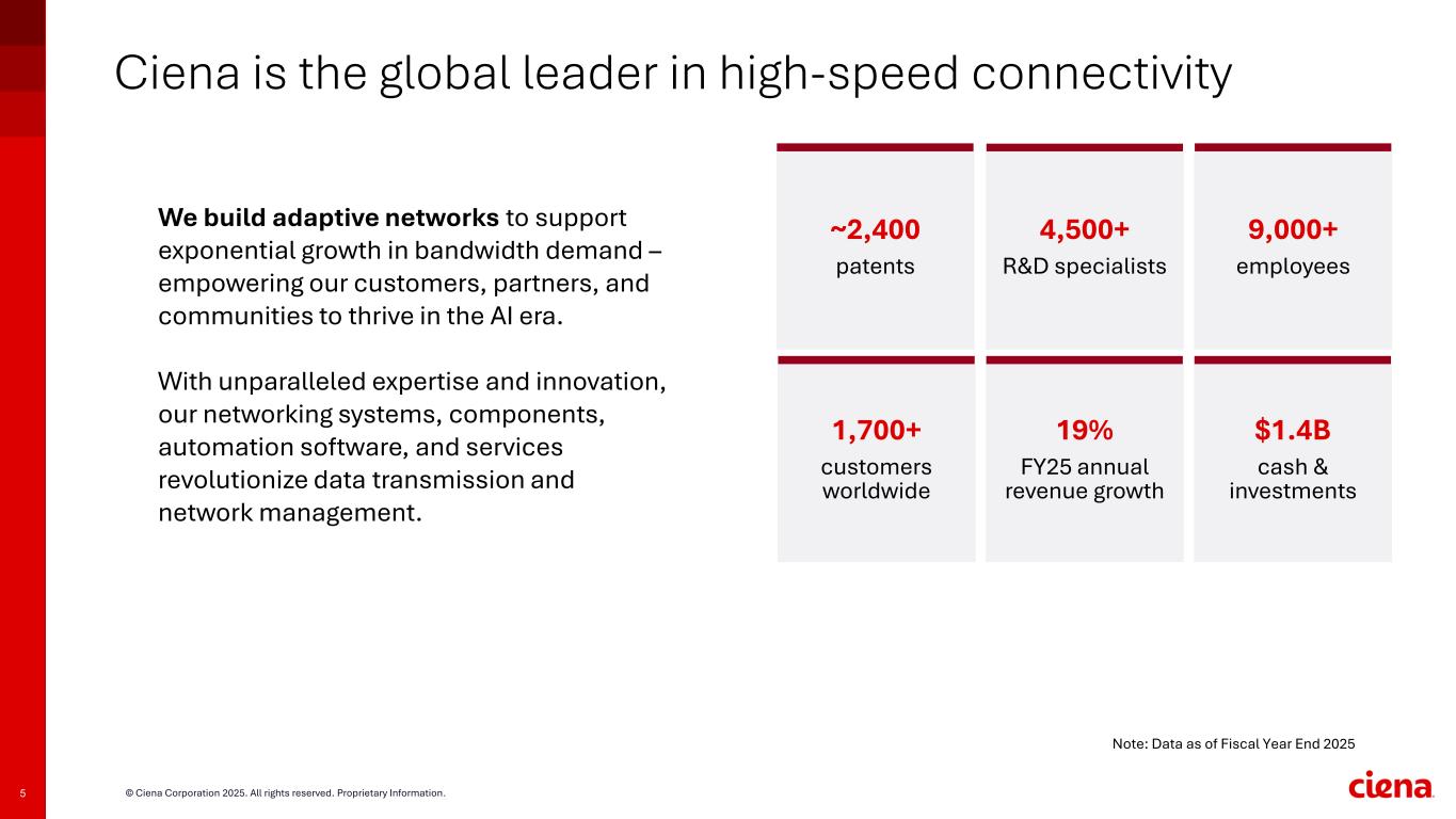 © Ciena Corporation 2025. All rights reserved. Proprietary Information.3 Table of Contents 1. Overview and Ciena's portfolio 2. Industry context and addressable market expansion 3. Ciena is positioned for accelerated growth 4. Fiscal year 2025 financial performance 5. Fiscal Q4 2025 financial performance 6. Fiscal year 2026 and Q1 outlook 7. Appendix