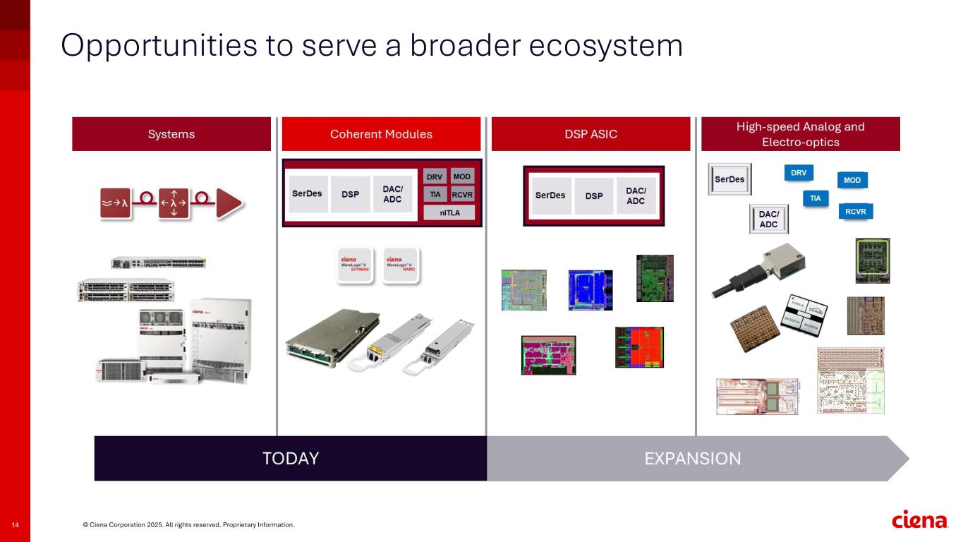 13 © Ciena Corporation 2025. All rights reserved. Proprietary Information. Our future growth opportunities Long-term growth in core business plus new higher growth addressable markets provide an opportunity to outpace our traditional revenue CAGR over time Inside & Around the Data Center Use Cases • 400G ZR, 800G ZR (WL6 Nano) and 1.6T ZR • Scale Across DC Clusters for AI Infrastructure Connectivity • Data Center Out-of-band Management (DCOM) • Coherent Lite (1.6T LR) • Components / High-speed Interconnects Inside DC ◦ Nubis' products WAN Use Cases • Subsea, Long Haul, Metro Regional, Metro DCI • Network upgrades to RLS and 1.6T WL6 Extreme • Multi-rail • Managed Optical Fiber Networks (MOFN)