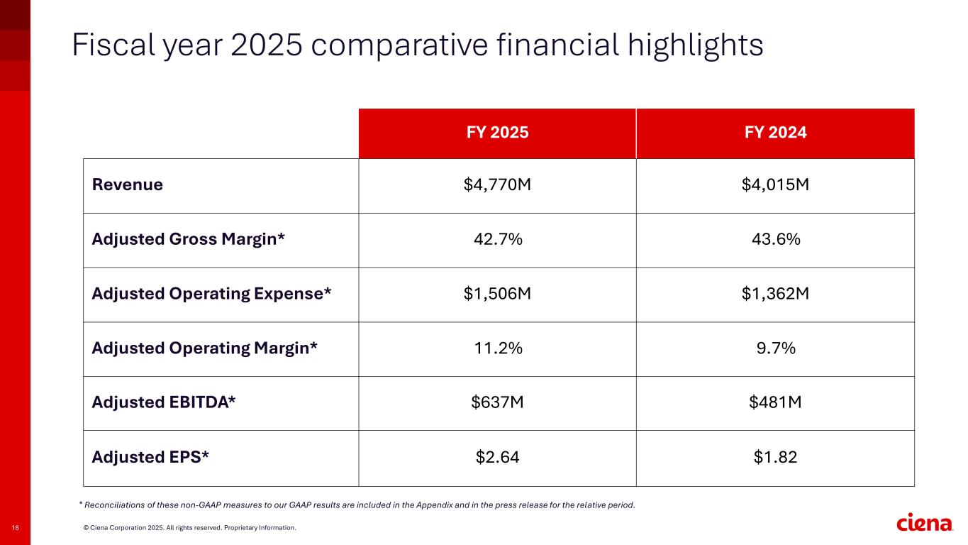 17 © Ciena Corporation 2025. All rights reserved. Proprietary Information. Fiscal year 2025 key highlights ▪ Extended leadership as global AI infrastructure provider of choice with more than 30 MOFN wins and more than 12 neoscaler wins ▪ Realized more than 100% YoY revenue and shipment growth in stand-alone coherent pluggables • Expanded our WL6e customer base by 68, strengthening our market lead of more than one year with the industry’s only 1.6 Tb/s coherent solution ▪ Launched our new Data Center Out-of-Band Management (DCOM), leveraging Ciena’s purpose-built routers and XGS-PON pluggables to reduce complexity, space, and power requirements ▪ Reached 171 Coherent Routing Solution customers in 2025, combining our Routing and Switching Portfolio, WaveLogic Nano Coherent pluggable technology and Navigator NCS • Ended the fiscal quarter with approximately $1.4 billion in cash and investments • Generated $665 million in free cash flow • Repurchased approximately ~4 million shares for $330 million, under our $1 billion three-year stock repurchase program (FY25-27) • Released our annual Sustainability Report, detailing our progress and performance across environmental, social, and governance programs • Continued to work towards our science-based greenhouse gas emissions targets and used 100% renewable energy in our facilities • Volunteered 37,600 hours and raised $3.4 million for community organizations from employee donations, matched giving, and volunteer rewards through our Ciena Cares program in FY2025 We are driving the pace of innovation We are committed to our people, communities, and the environment We have a strong business and financial model